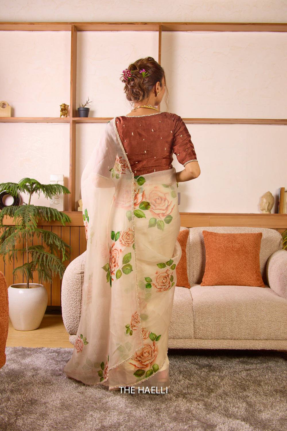 A beautiful saree with structured fall, printed rose motifs with a delicately hand-embroidered border with pearls and beads