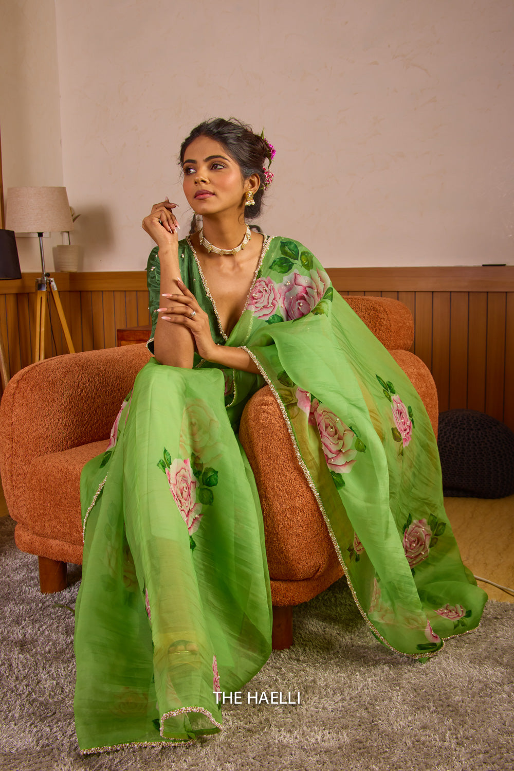 A beautiful saree with structured fall, printed rose motifs with a delicately hand-embroidered border with pearls and beads