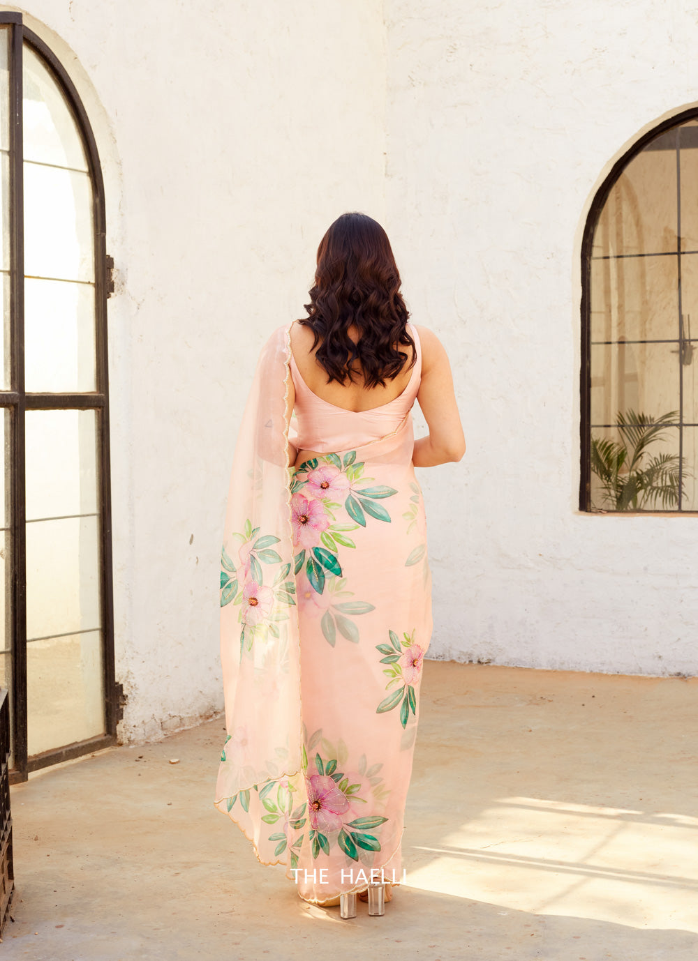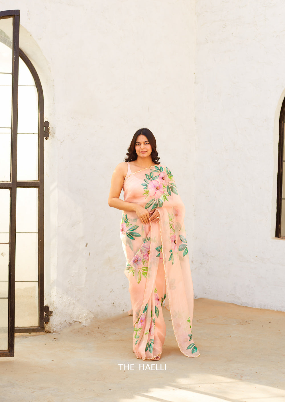A regal piece with printed floral motifs highlighted with hand-embroidered cut dana, sitara and zari on pure organza silk saree. And a beautiful and delicate scallop hand-embroidered border.