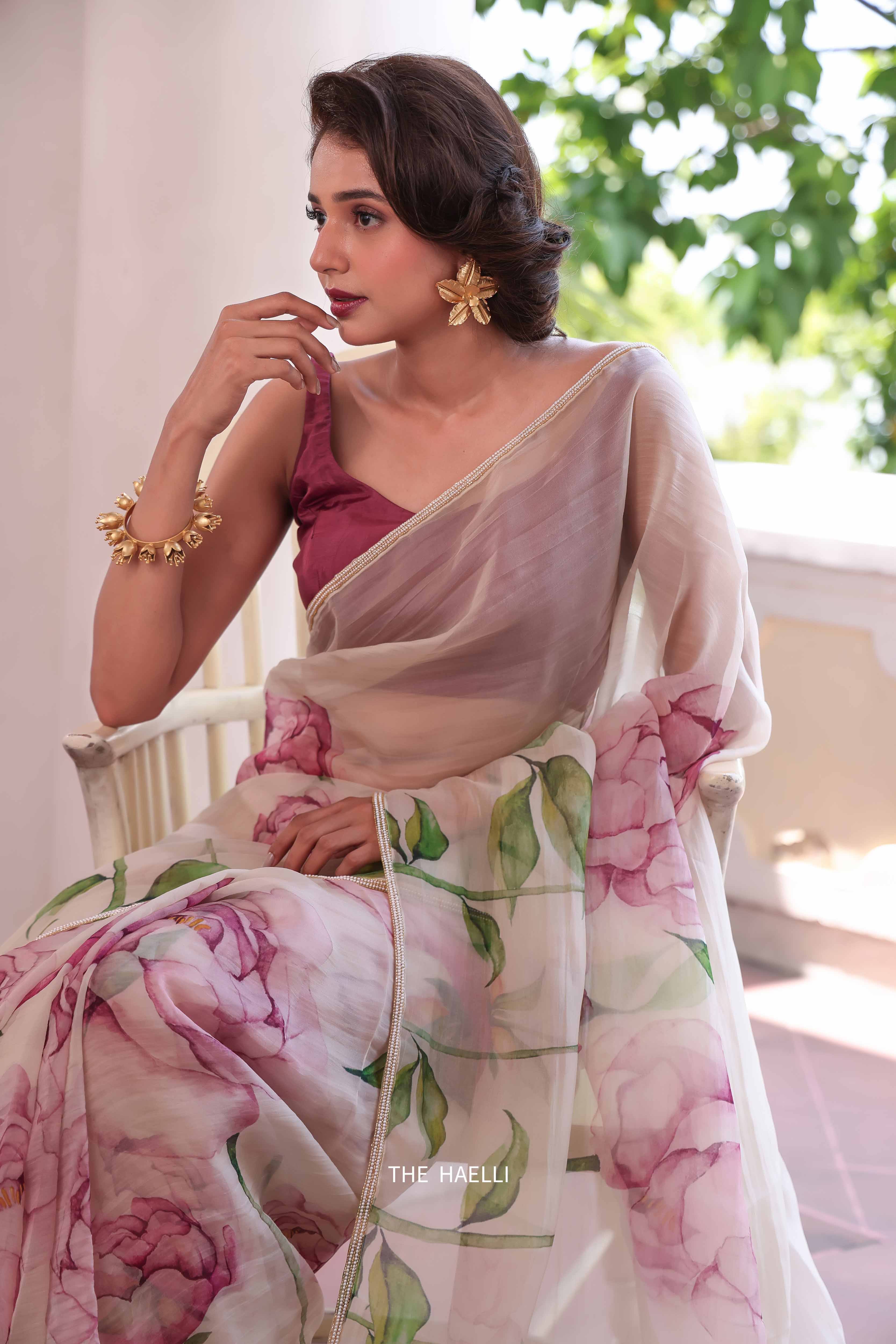 A beautiful saree with structured fall, printed rose motifs with a delicately hand-embroidered border with pearls and beads.