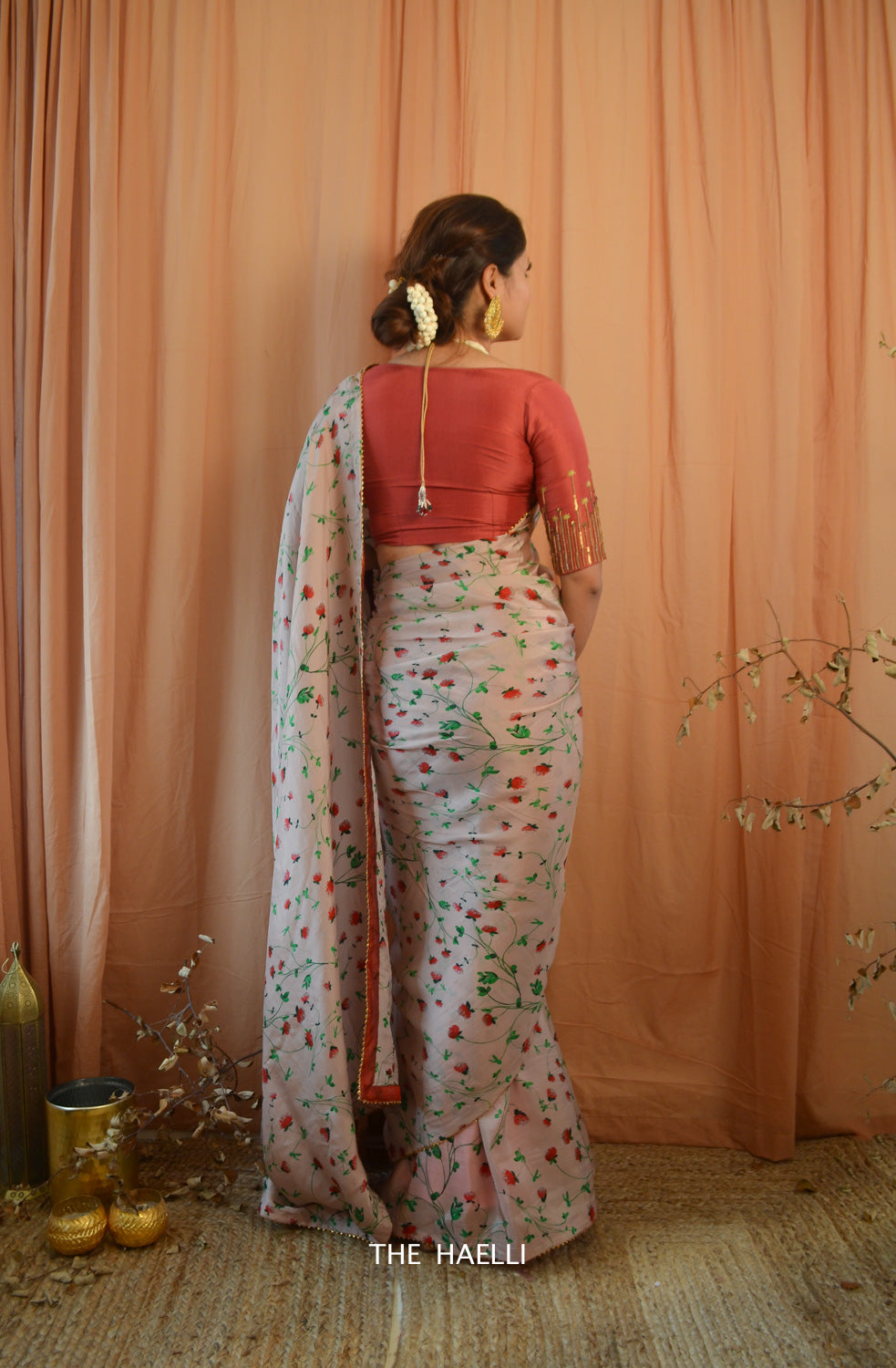 Delicate yet bold, this pale pink silk saree has printed floral pattern and gold gota border all over. Perfect for a subtle yet classy look.