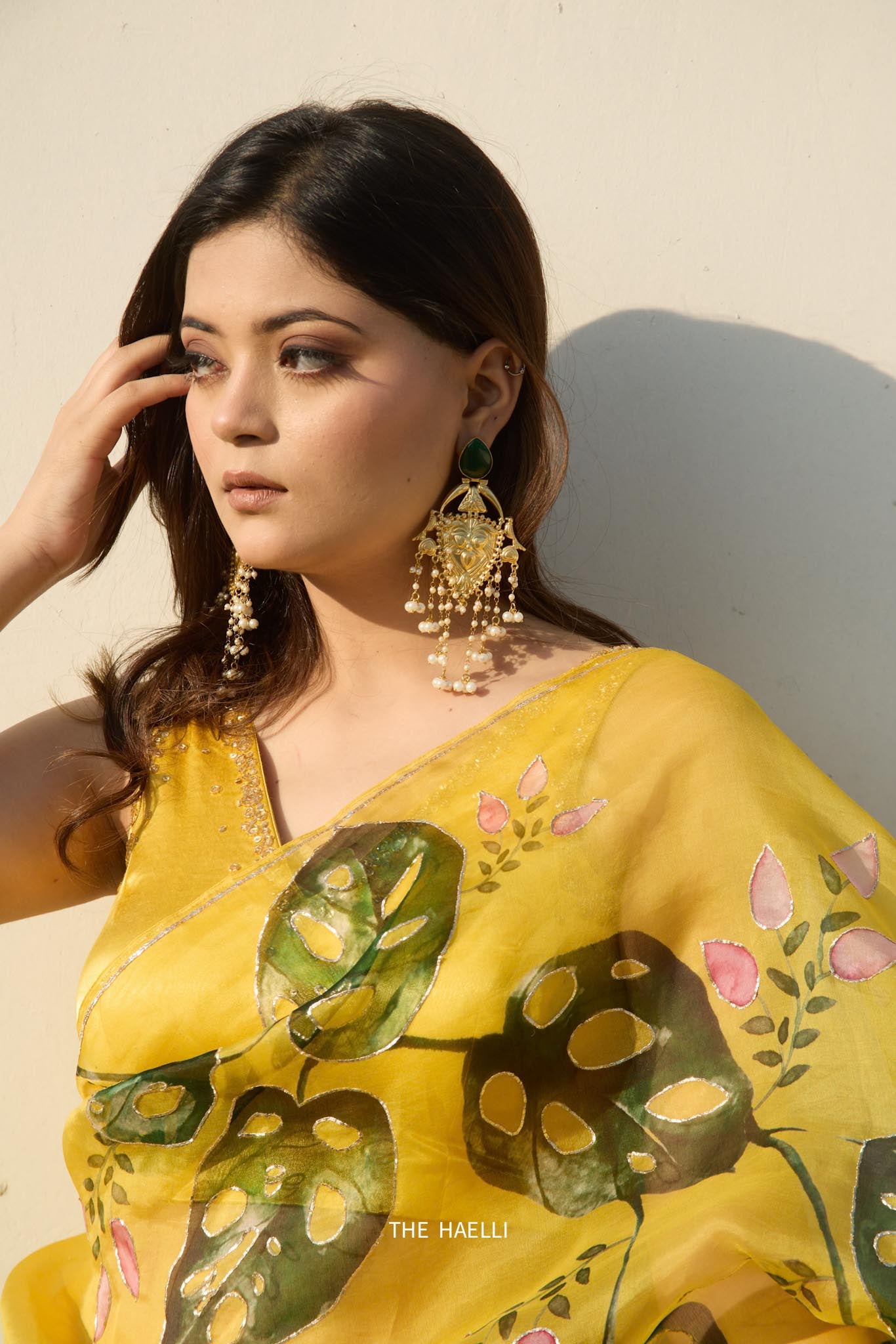 NOTE: Slight difference in the color is possible due to photography lights and different screen resolution of mobile or laptop screens. Slight irregularities in organza fabric like weaving or white marks, if visible, indicates fabric's purity and is not considered defected. Dimensions may vary slightly with each lot, since products are not mass produced. Fall attached, blouses stitched/unstitched or underskirts listed along with the saree may have slight color differences as compared to the saree since colors may appear dissimilar on different fabric qualities.