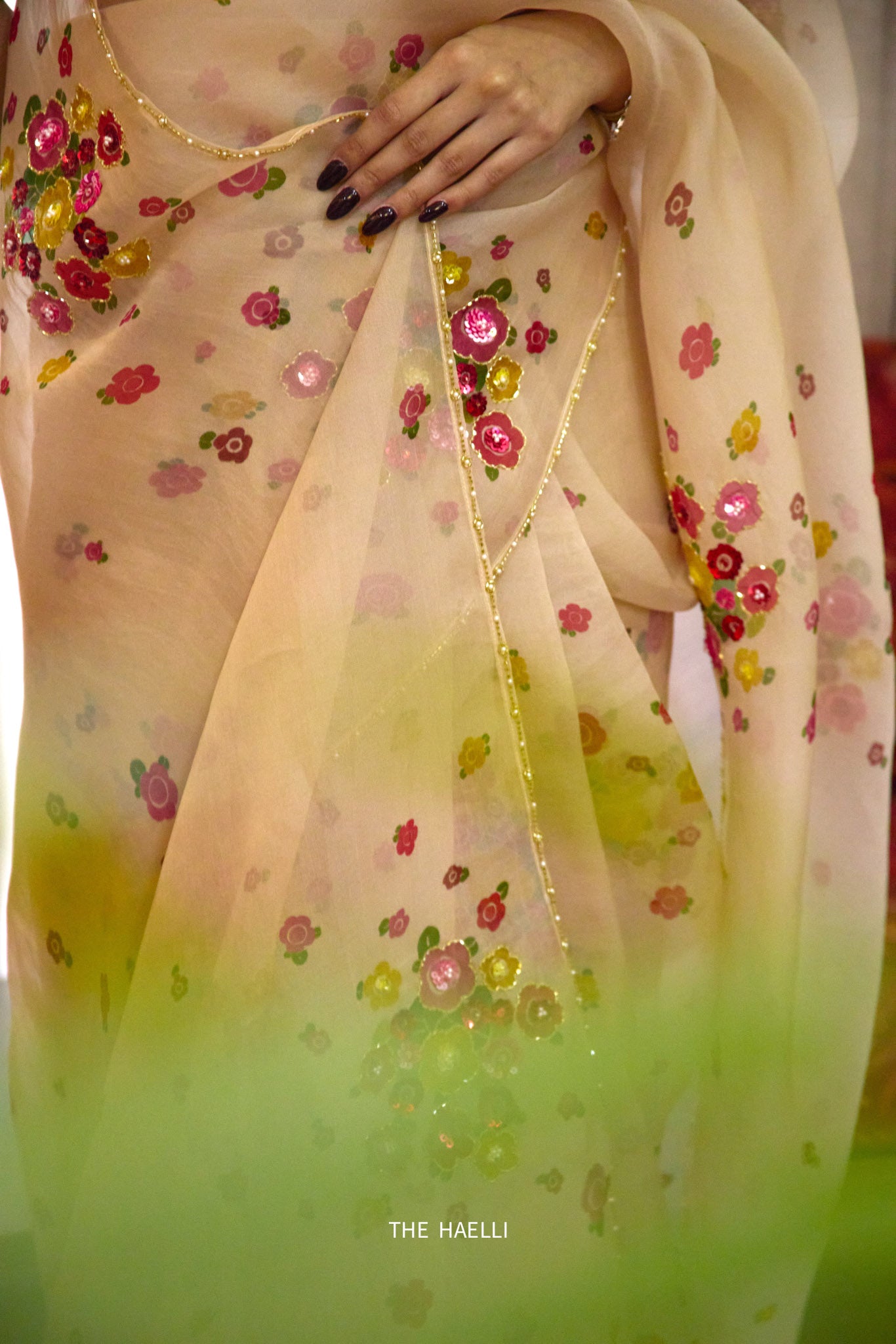Delicate, lustrous pure organza silk saree with beautifully printed floral pattern, intricately hand embroidered through multicoloured sitara, cutdana beads along with a defining border
