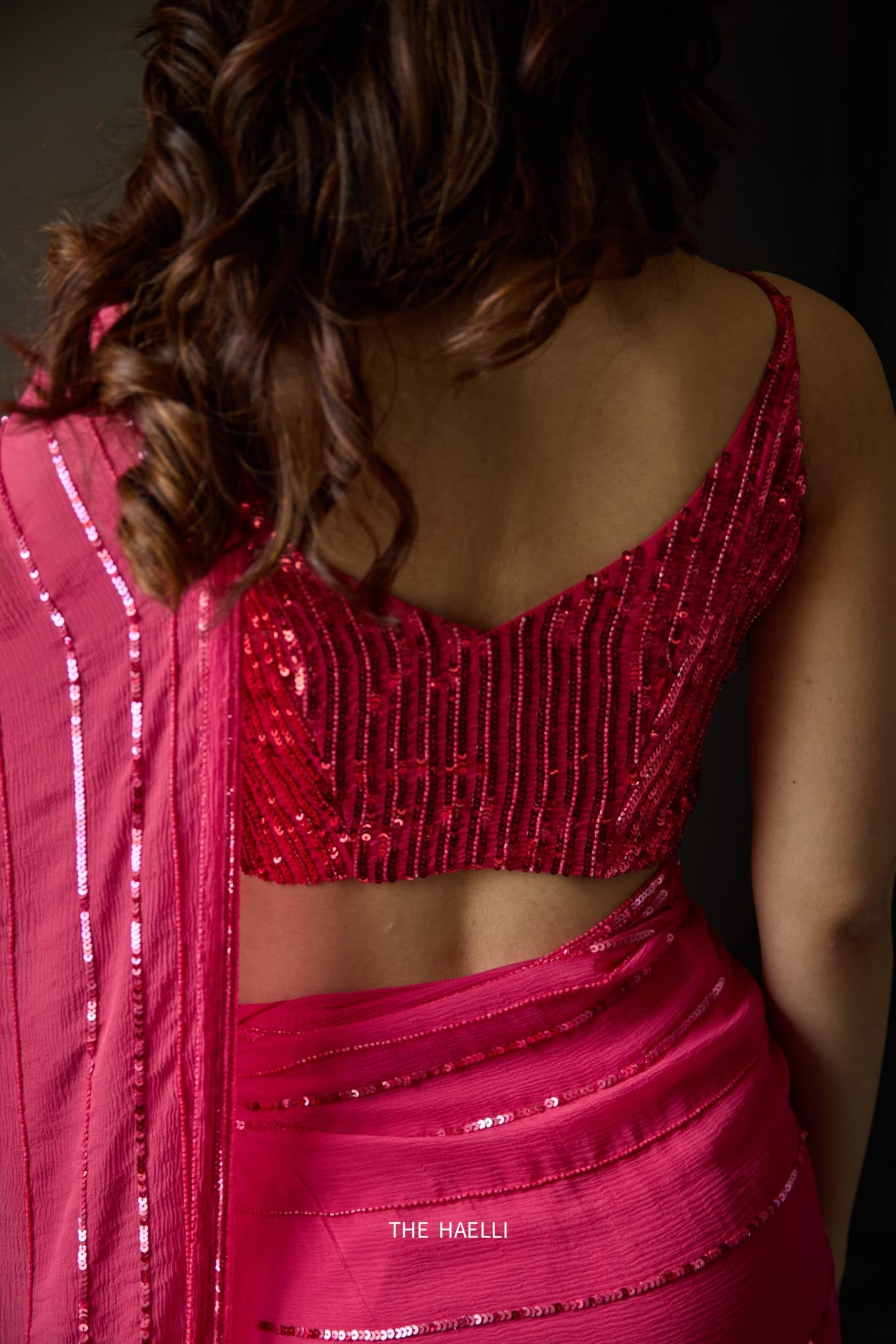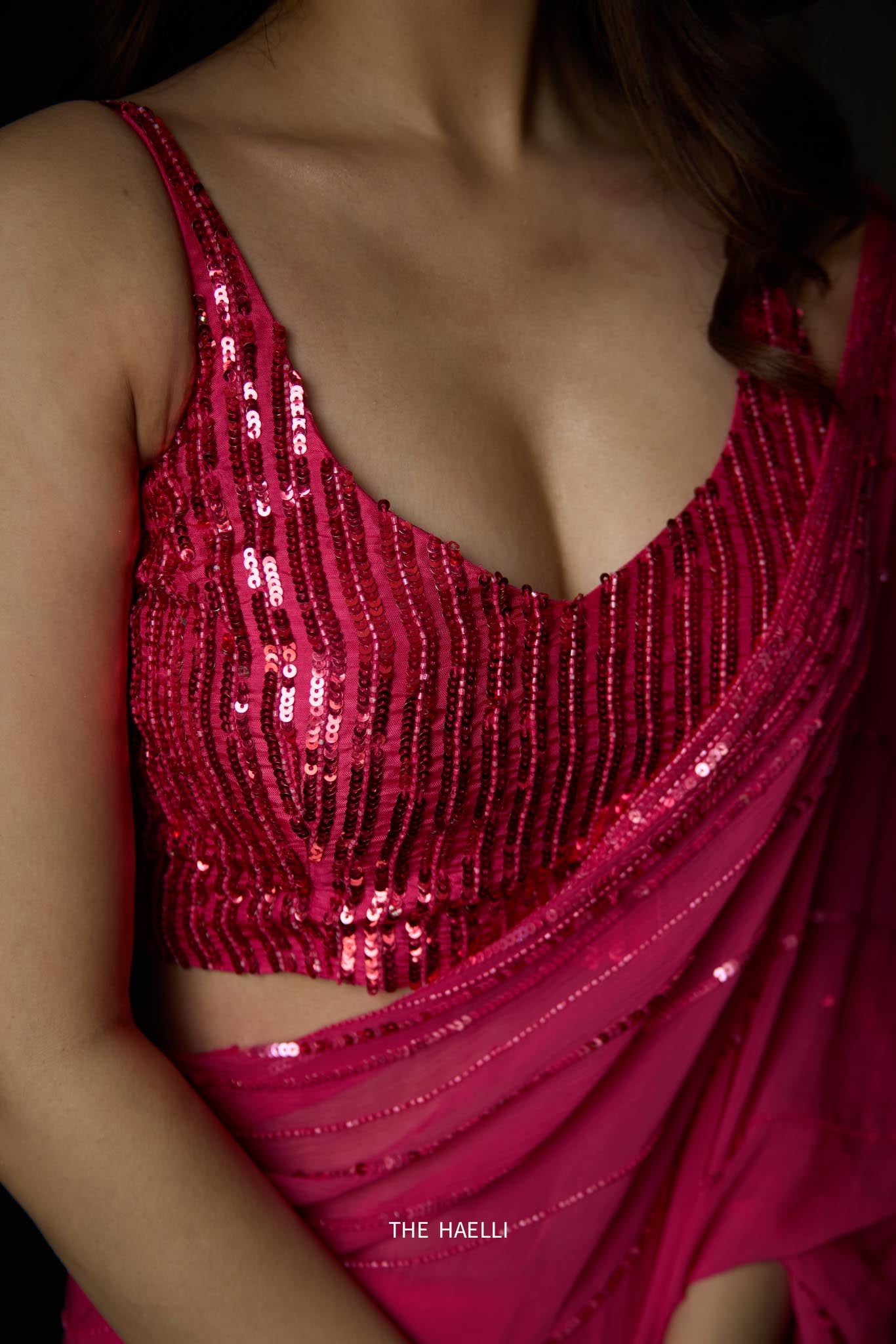 The chrome Blouse designed in Uppada Silk comes with hand embroidered sequin work. The Fuchsia pink colour with V-neck and sleek shoulder makes it outstanding find for your glam evenings.