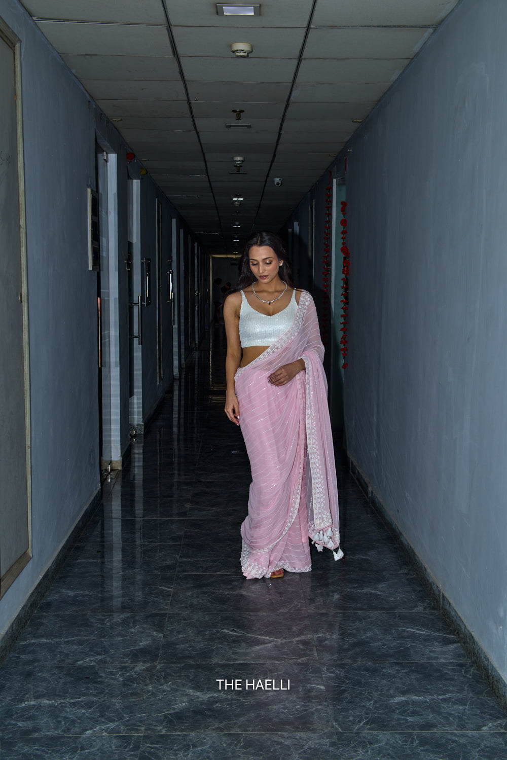 A saree so delicately put together through hand-embroidery using pearl, sitara and cutdana. Complementing white pearl tassels adds perfect grace to the saree.