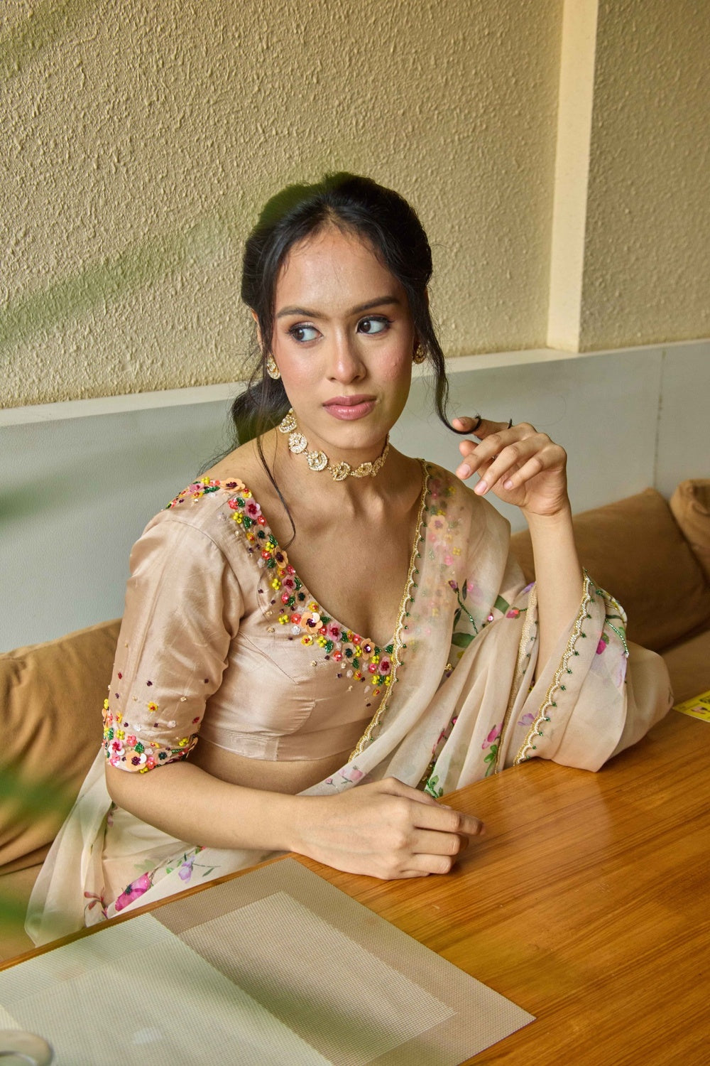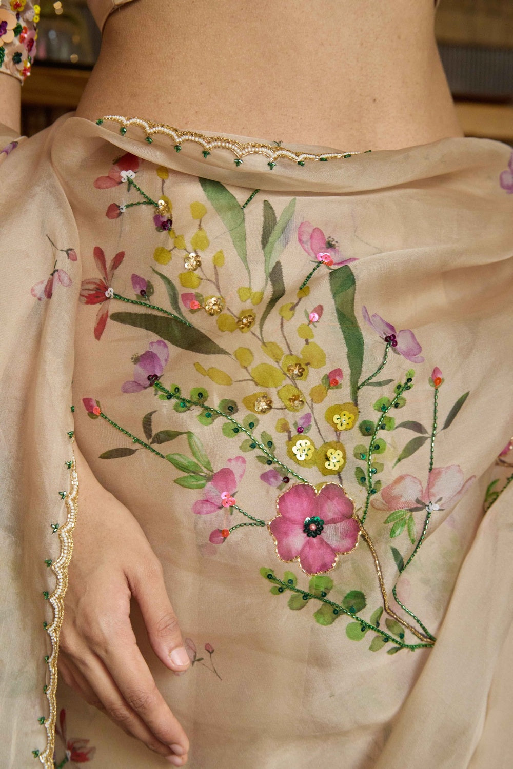 Crafted with organza silk GUL is designed with intricate hand embroidery over the floral print for the fresh yet delicate feel. The beige base with hues of multi color gives it an ethereal look. It is further highlighted with the thin embroidered border making it perfect for your summer wardrobe.