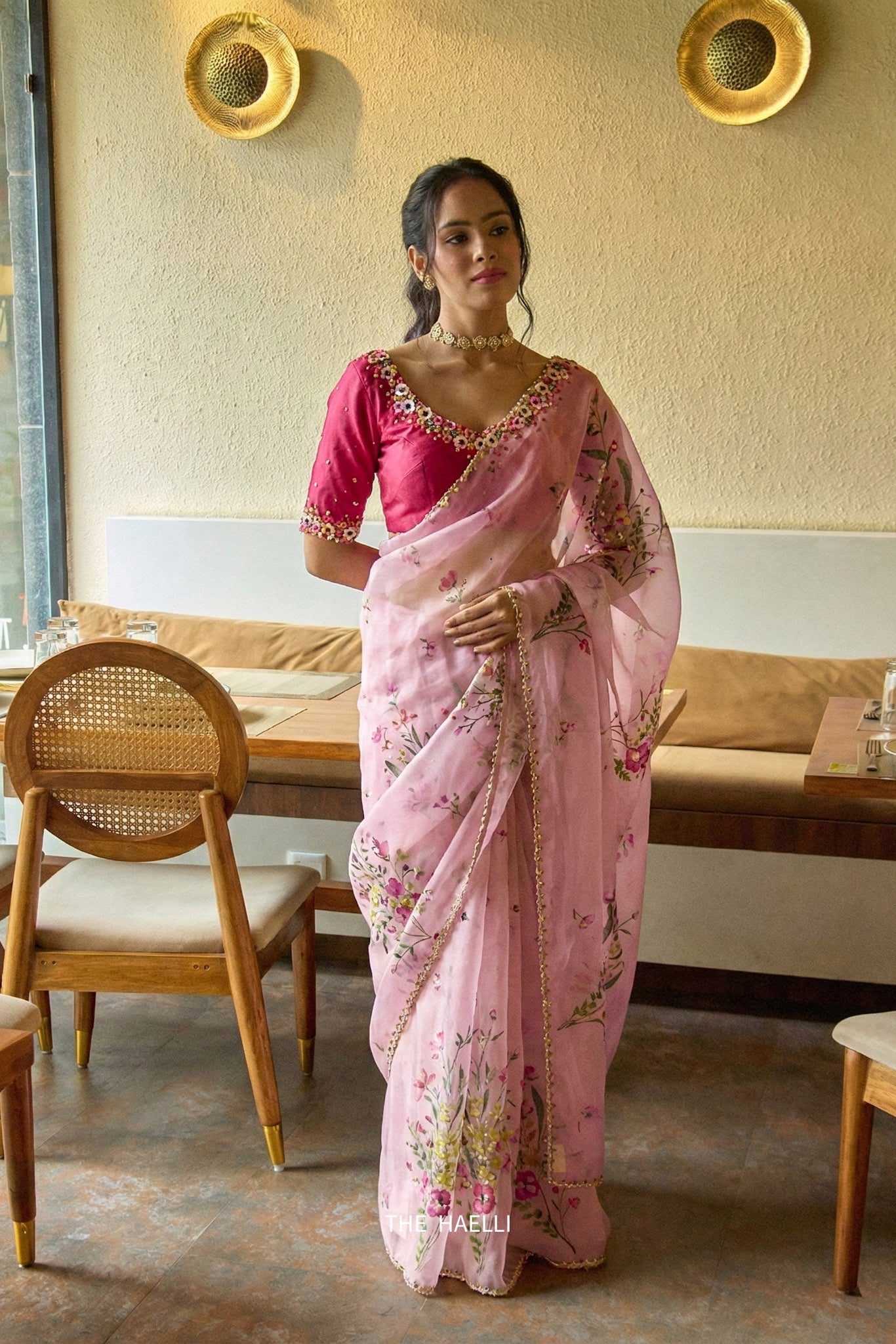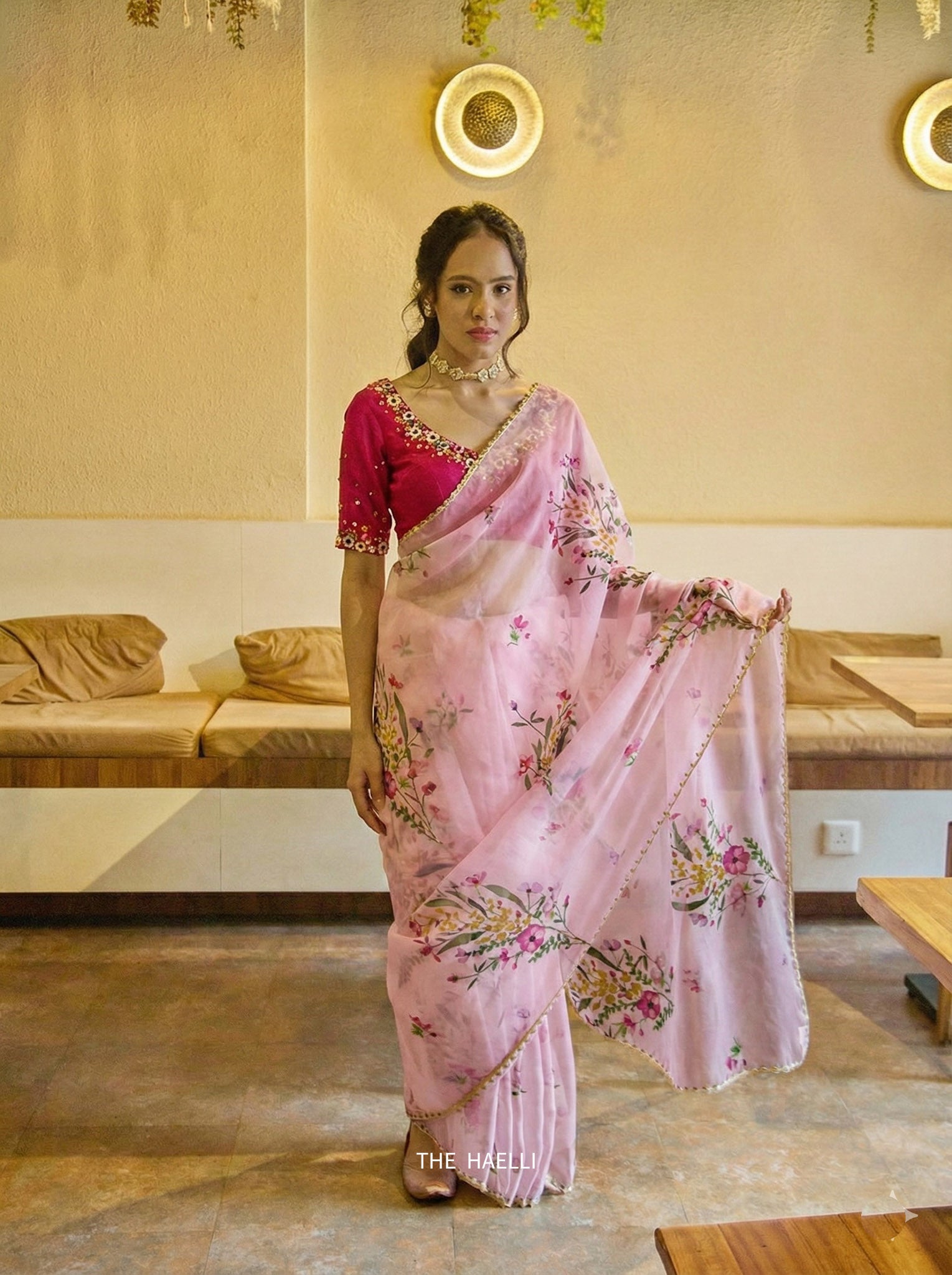 Crafted with organza silk GUL is designed with intricate hand embroidery over the floral print for the fresh yet delicate feel. The pink base with hues of multi color gives it an ethereal look. It is further highlighted with the thin embroidered border making it perfect for your wardrobe.