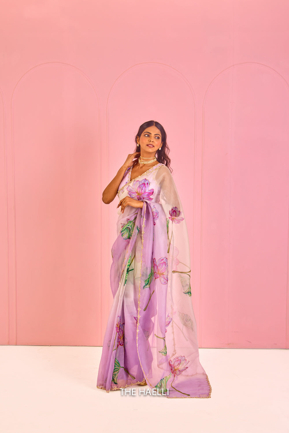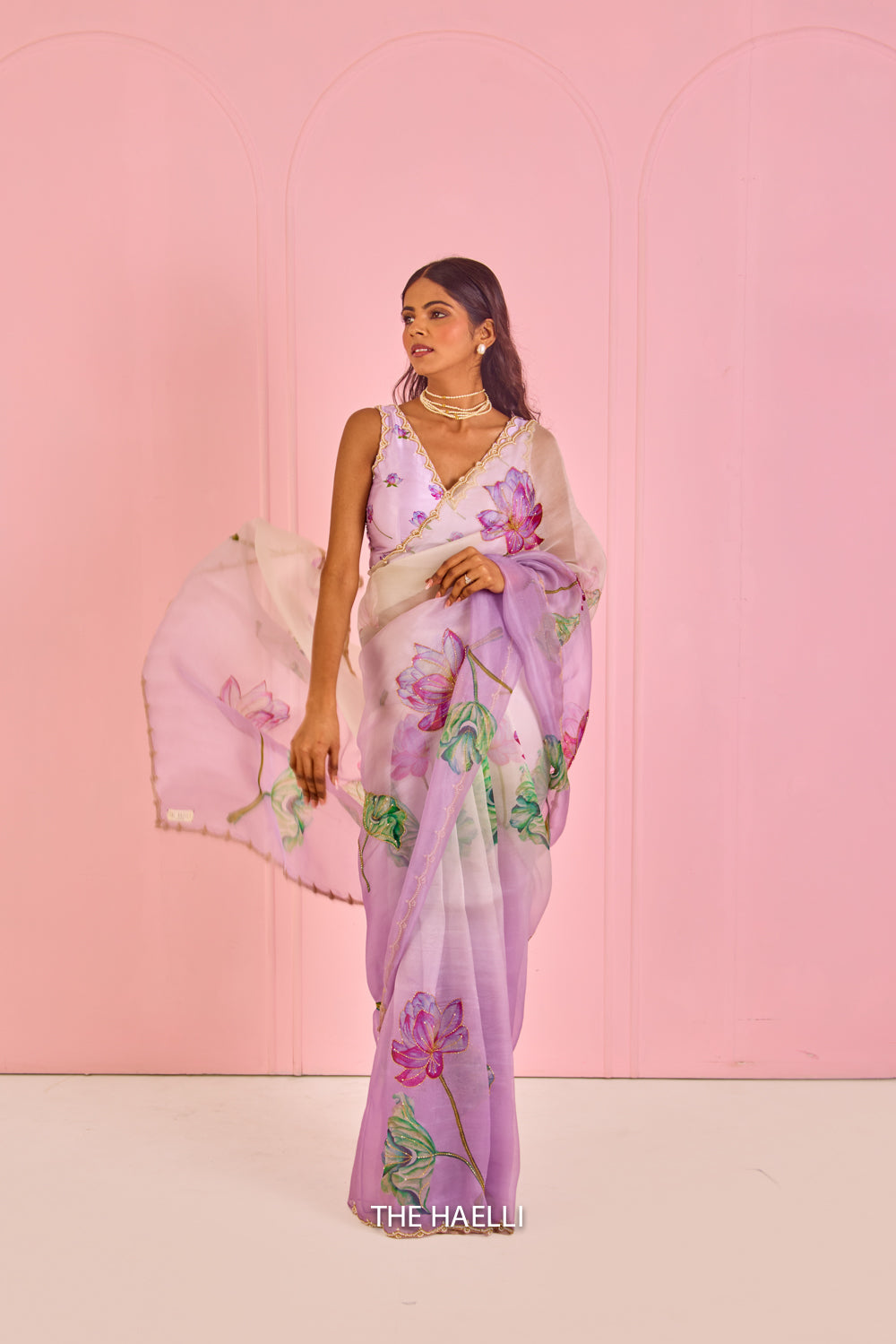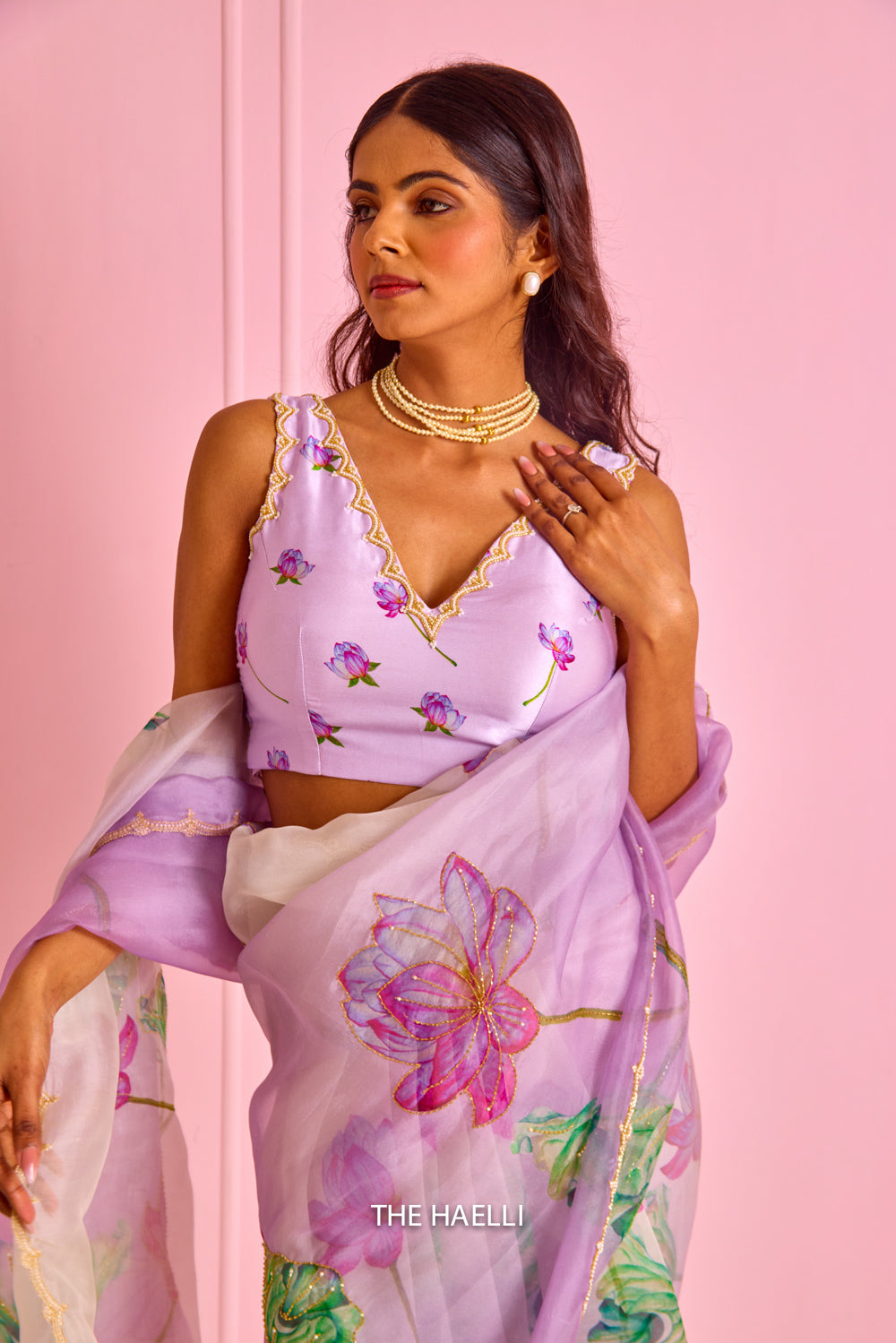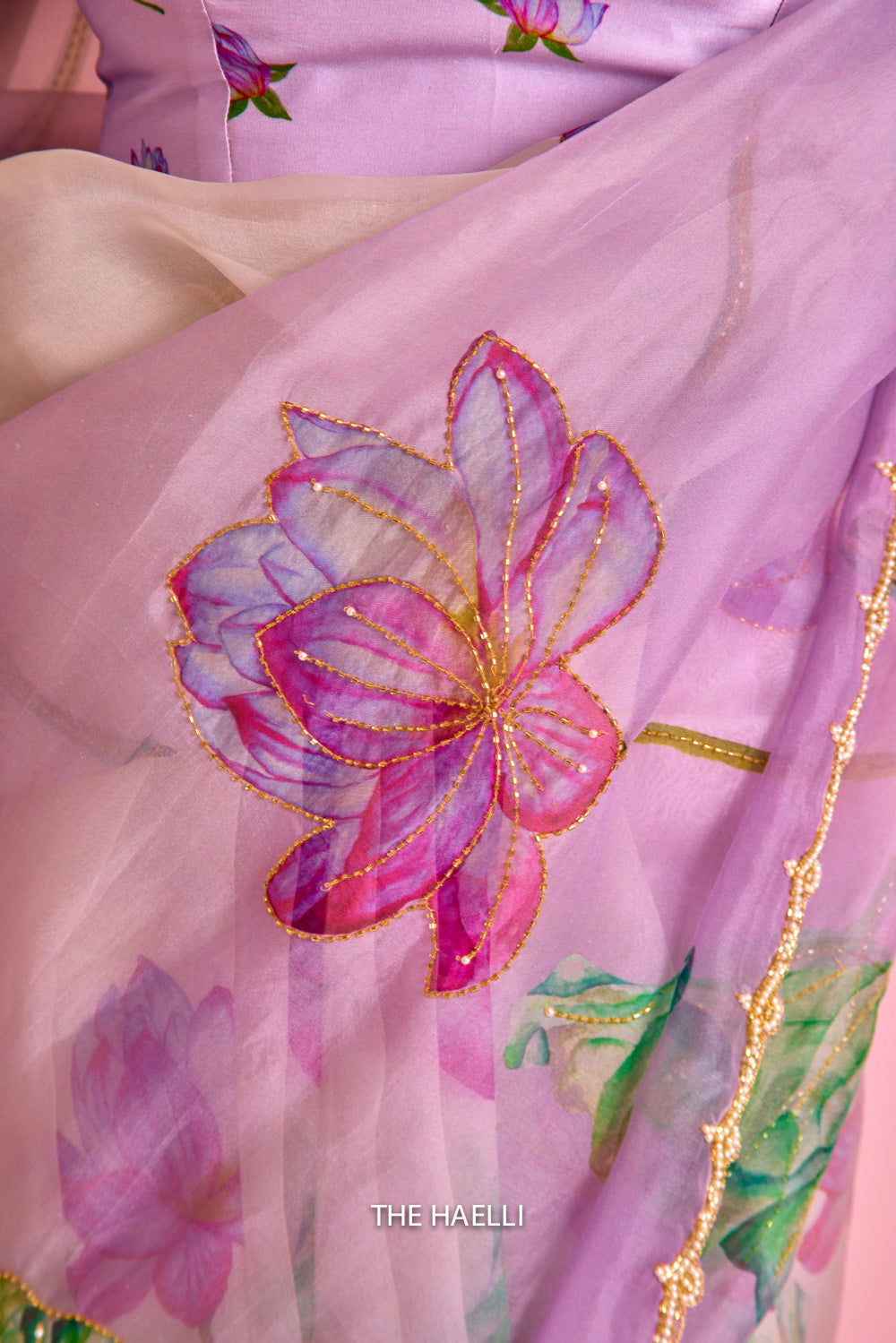 A beautiful piece with printed lotus motifs highlighted through cut-dana, sitara, pearls and zari along with a beautiful and delicate scallop hand-embroidered border.