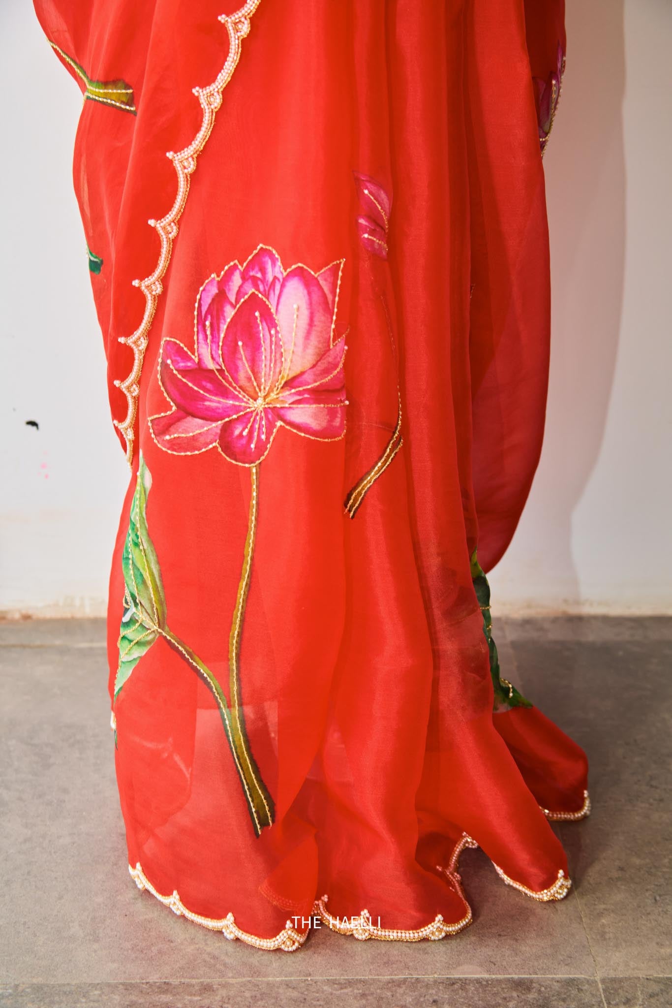 A beautiful piece with printed lotus motifs highlighted through cut-dana, sitara, pearls and zari along with a beautiful and delicate scallop hand-embroidered border.
