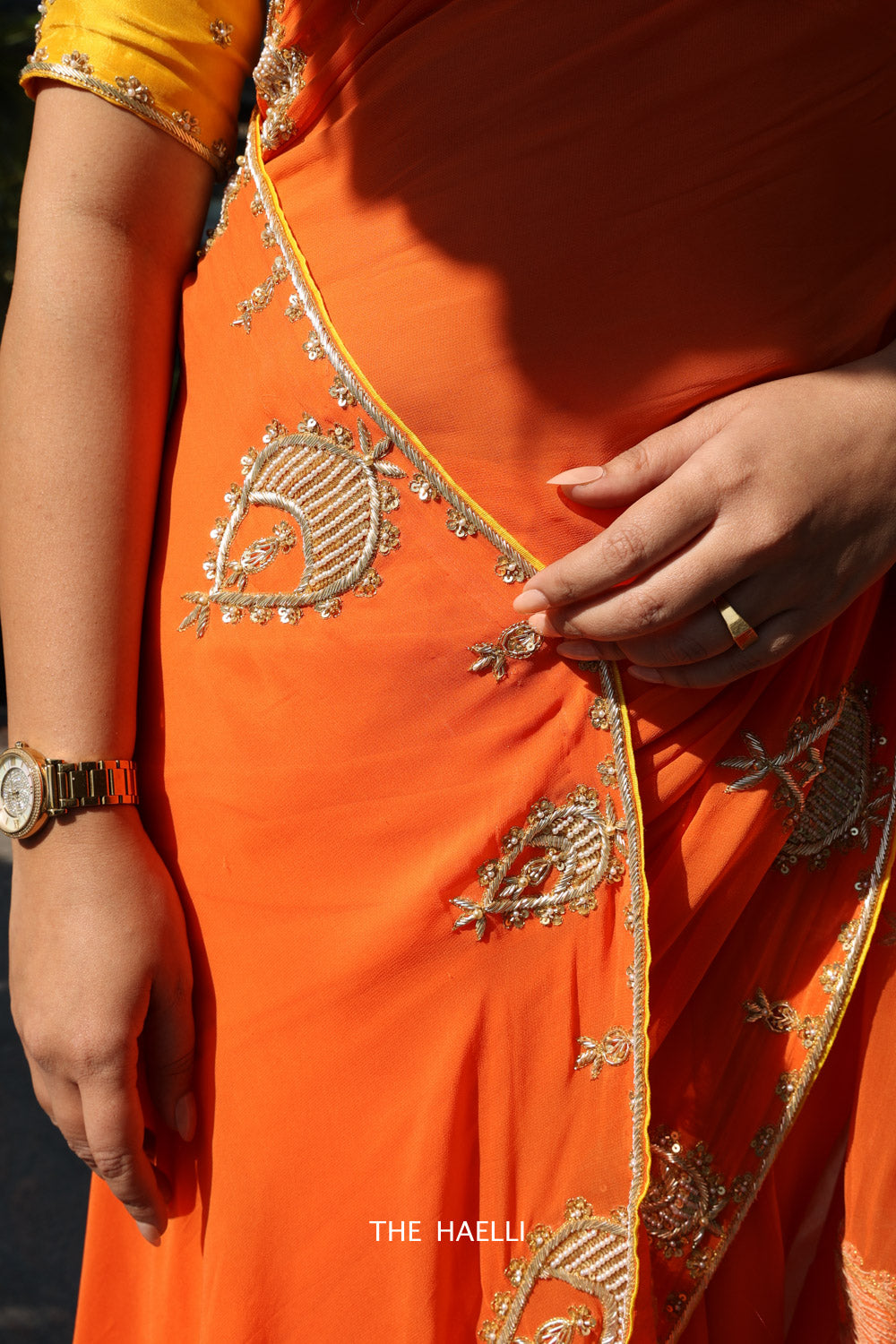 A saree so delicately put together through hand-embroidery using dabka, nakshi, pearl, sitara and zari. Complementing yellow border with gold dabka work adds perfect grace to the saree.