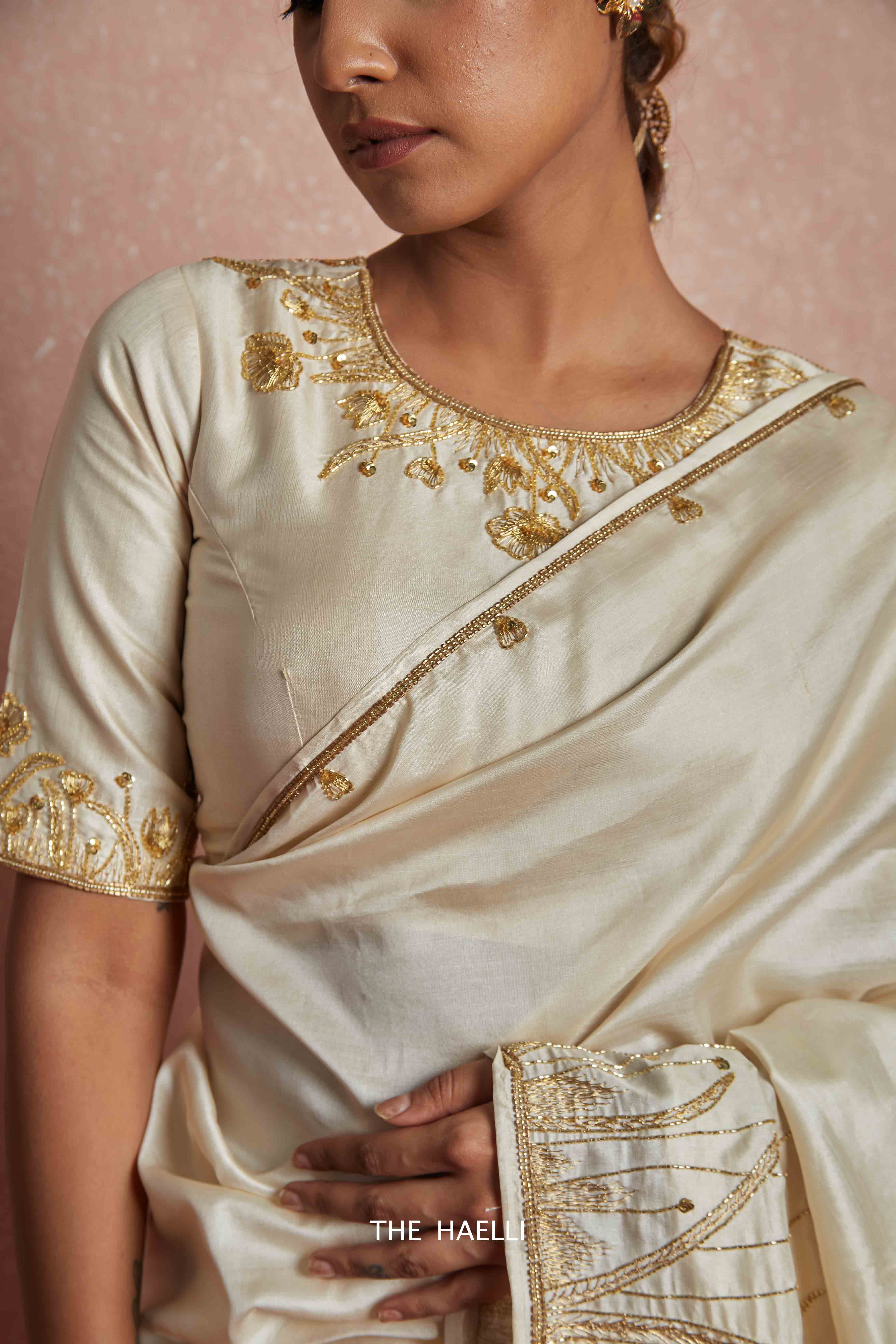100% handloom pure tussar silk saree enhanced with delicately hand-embroidered motifs with zari, pearl, cutdana and sitara along with defining border
