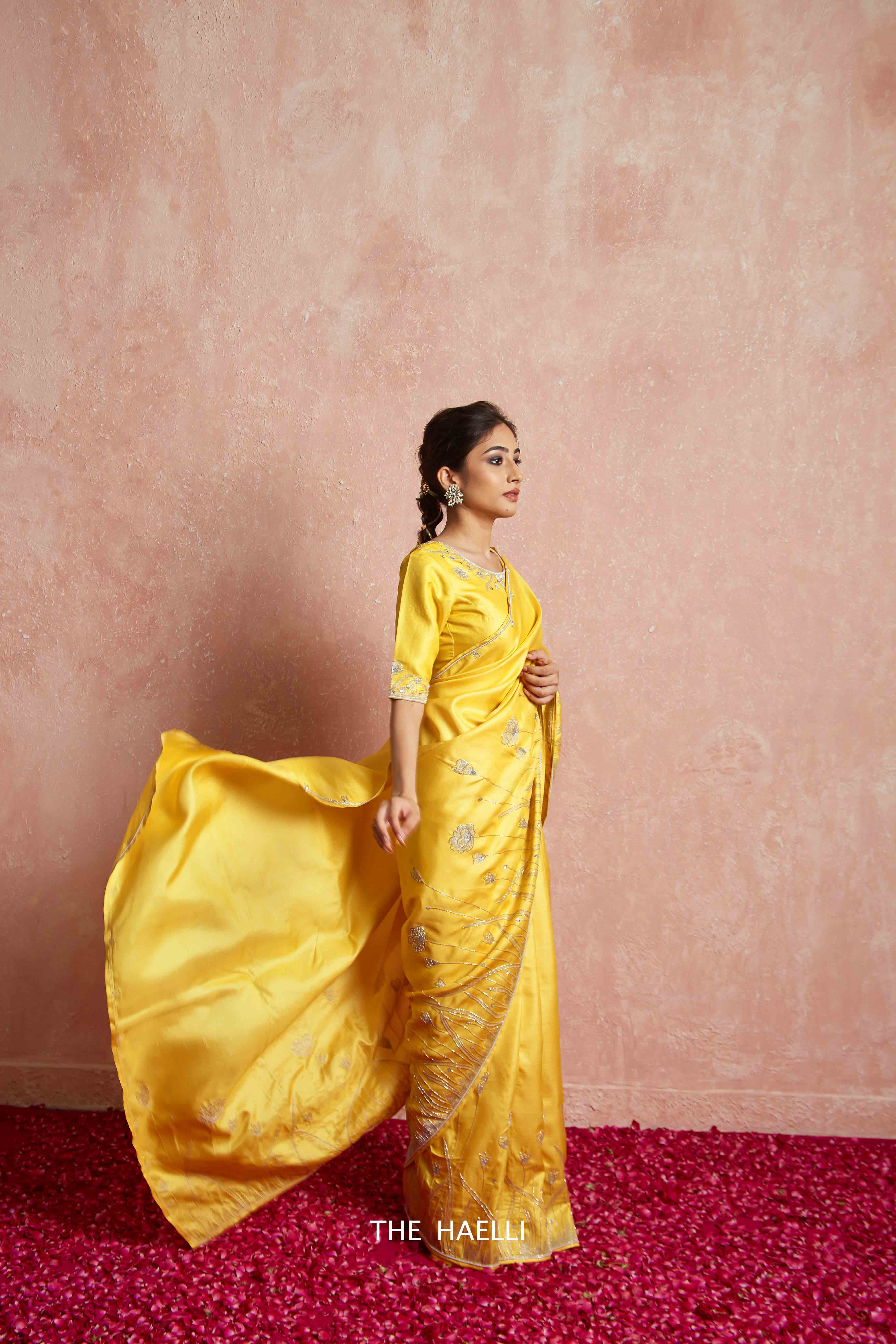 100% handloom pure tussar silk saree enhanced with delicately hand-embroidered motifs with zari, pearl, cutdana and sitara along with defining border