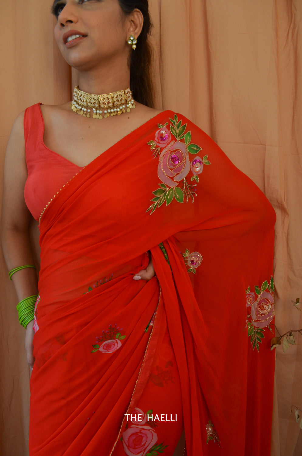 Perfect saree for your festive season, printed roses in shades of pink over georgette saree enhanced through hand-embroidery with sitara, cut dana and silk thread.