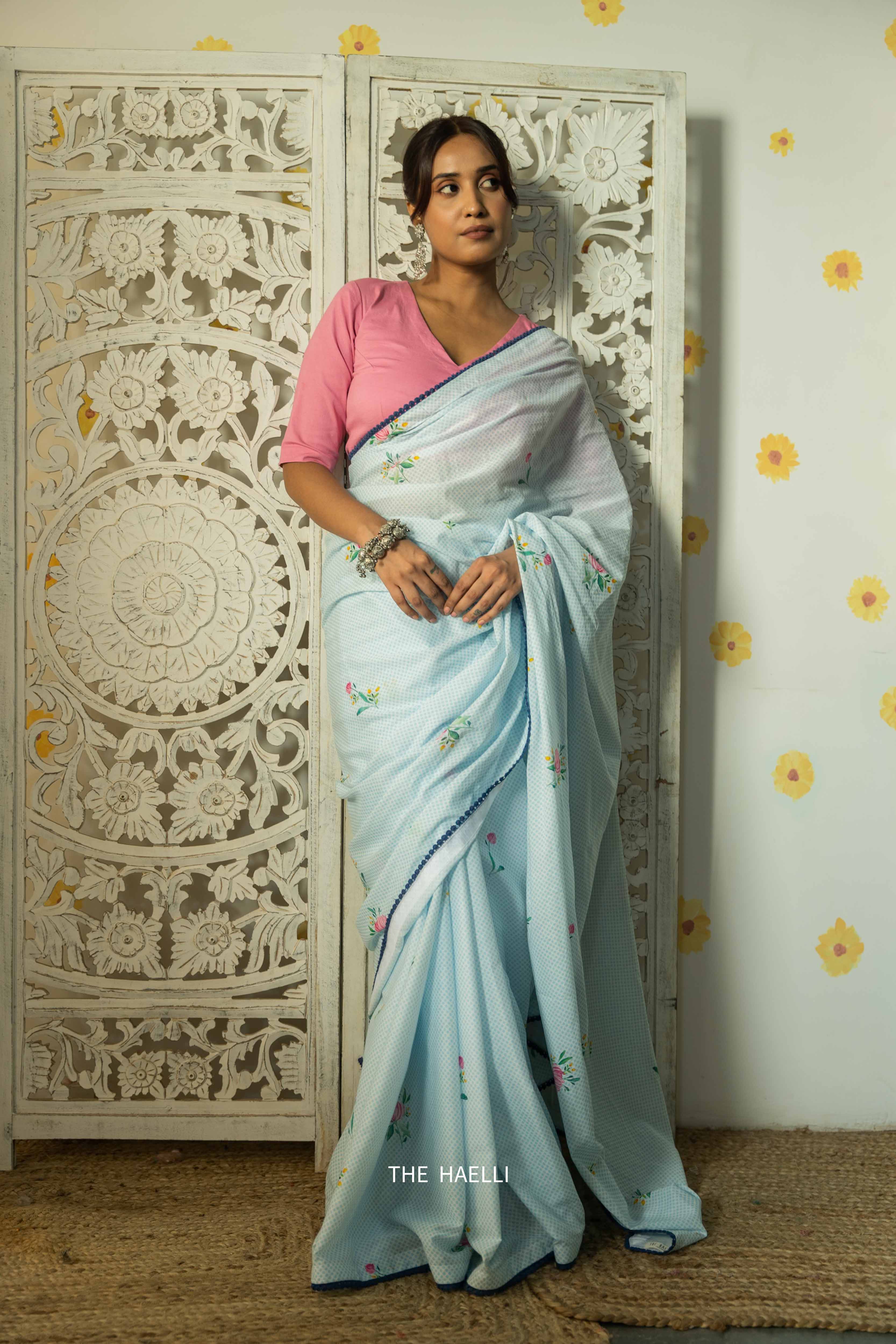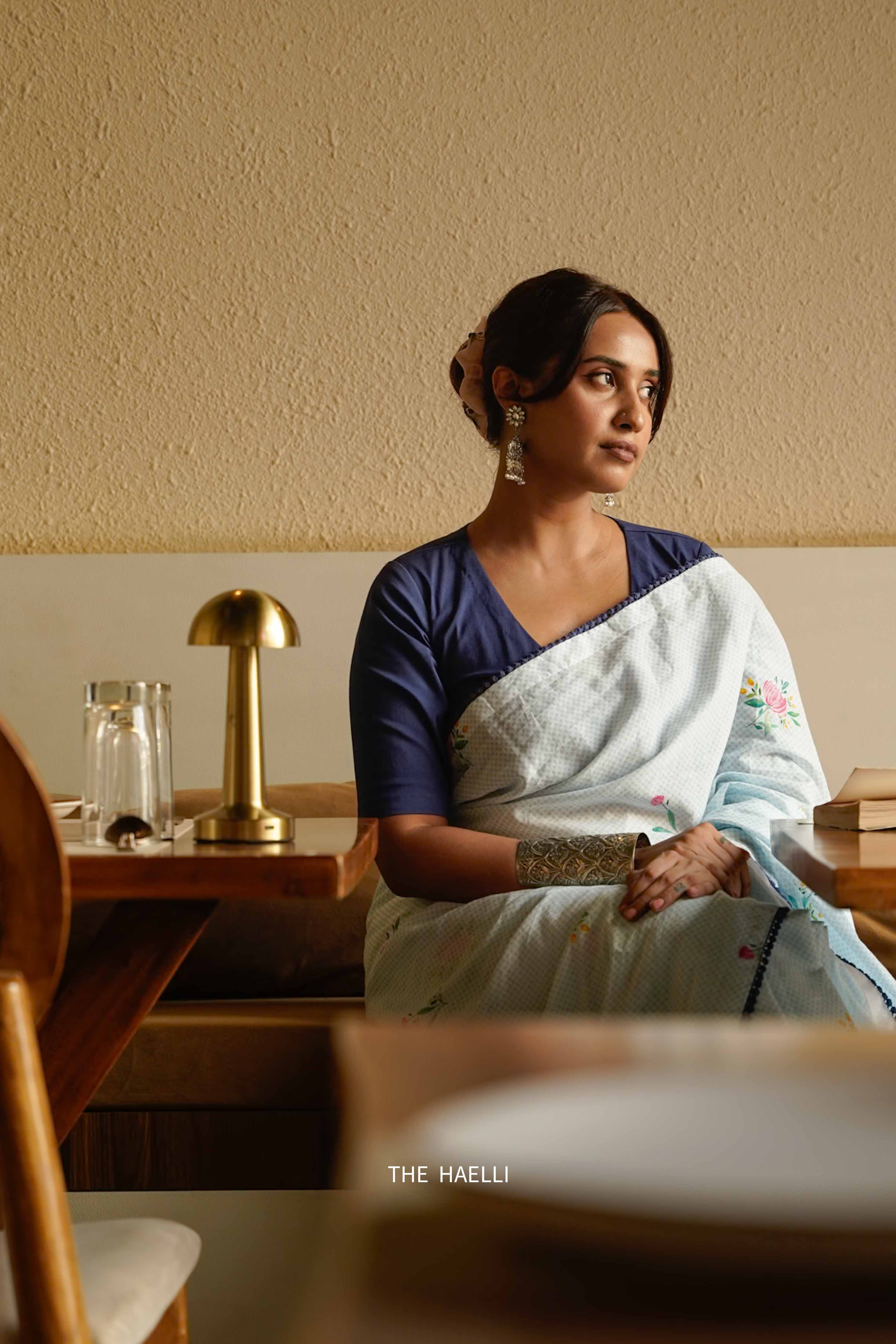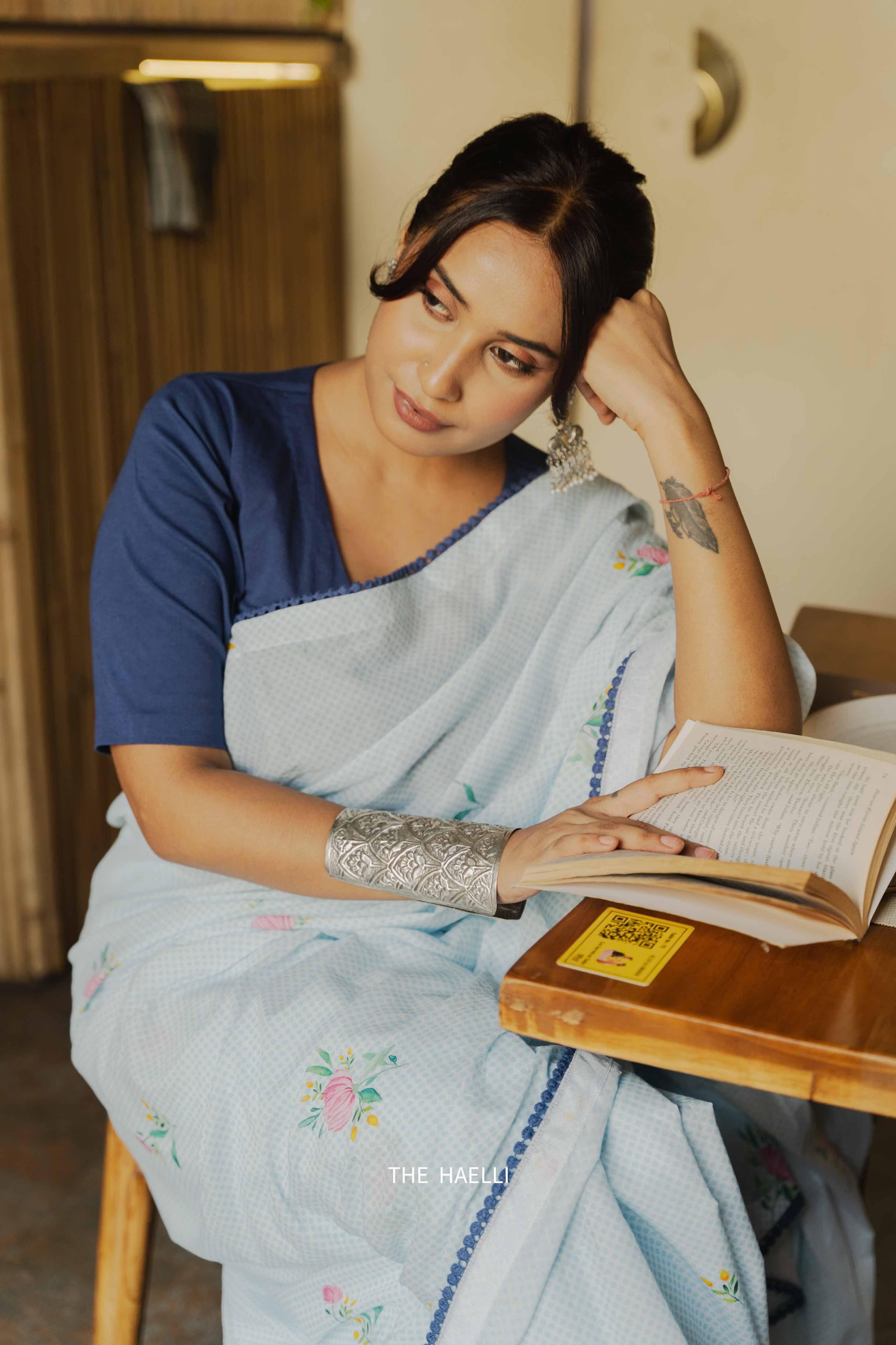 A breezy pure cotton mul saree featuring a soft white base adorned with playful blue polka dots and delicate floral prints. Finished with a dark blue lace border, it strikes the perfect balance between charm and comfort.