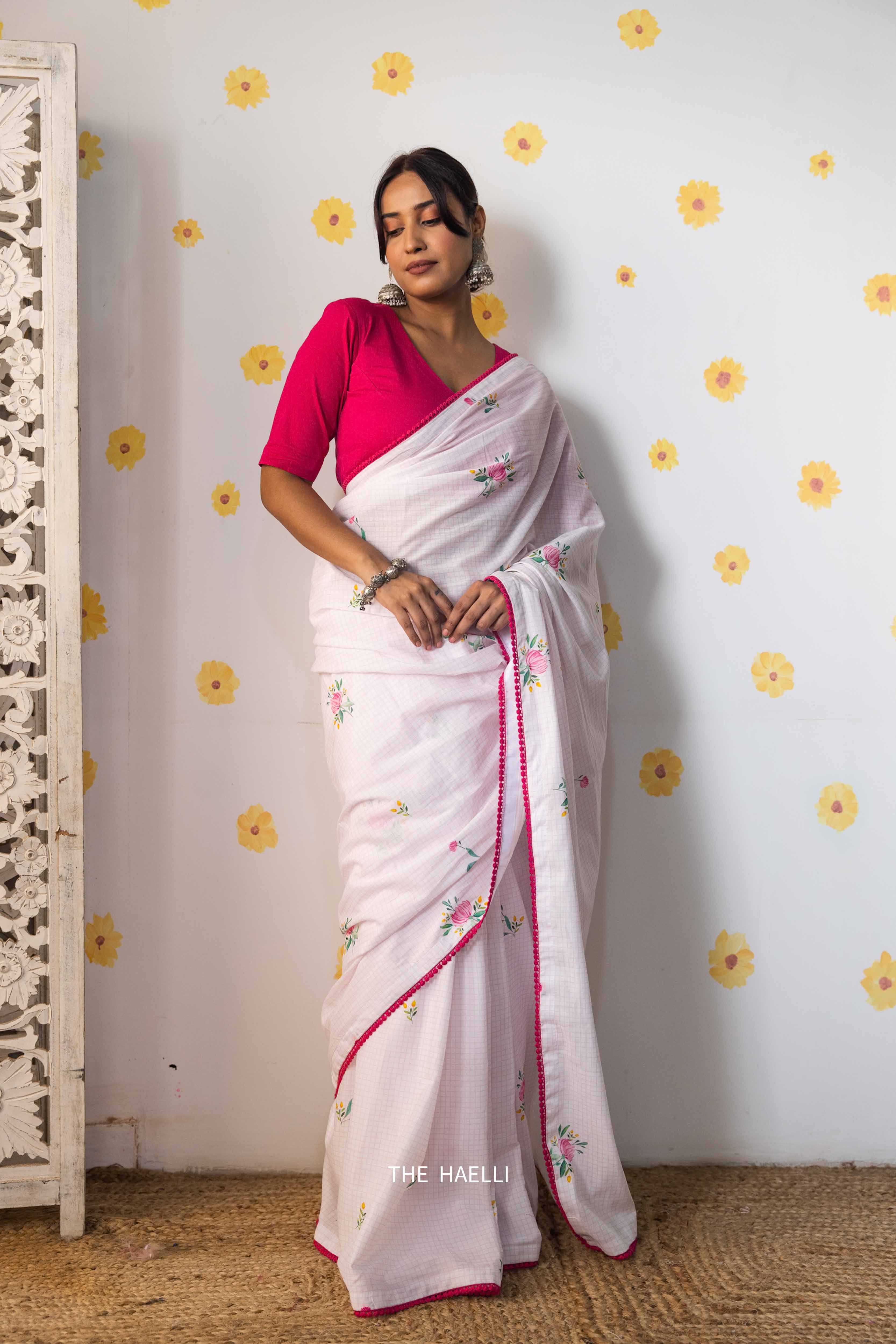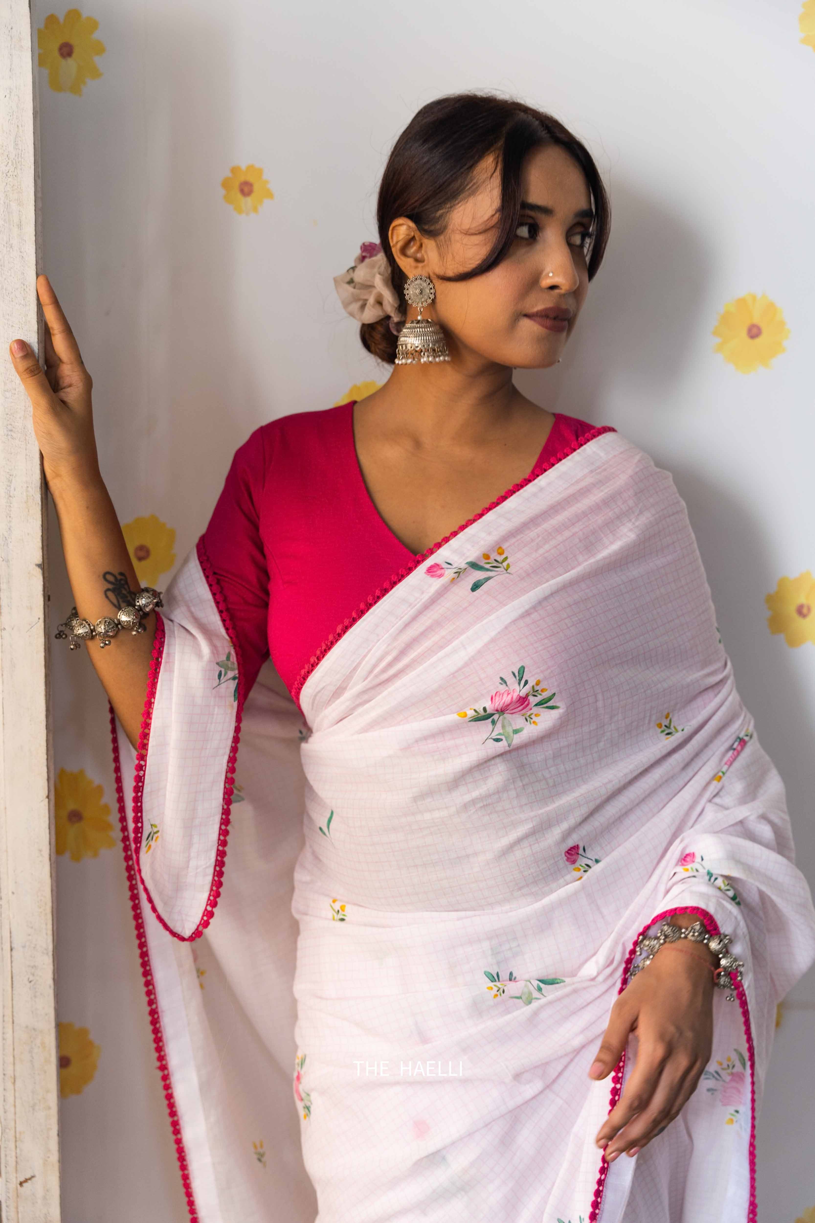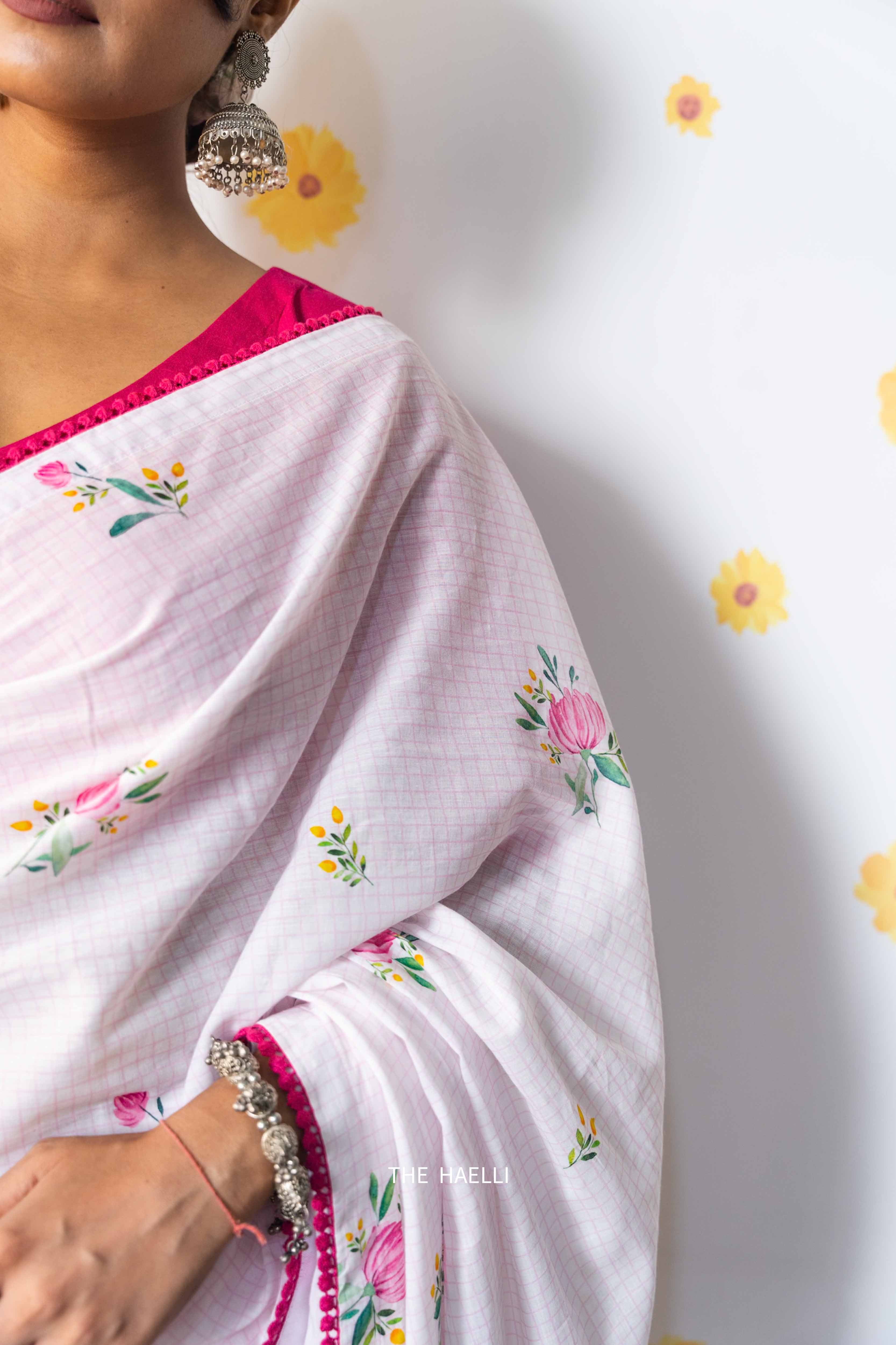 A breezy pure cotton mul saree featuring a soft white base adorned with delicate pink checks and subtle floral prints. Finished with a charming dark pink lace border, it's a perfect blend of elegance and everyday comfort.