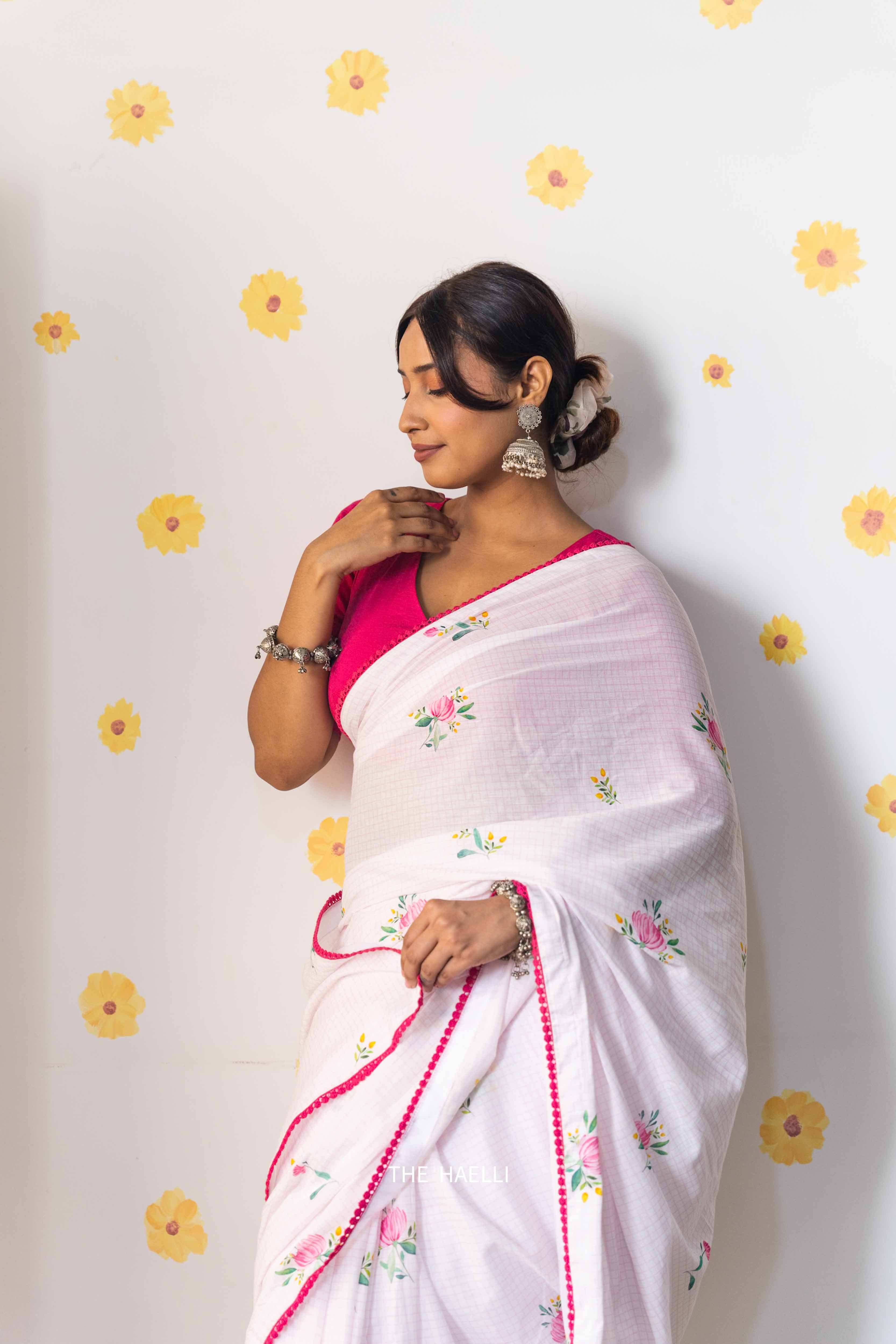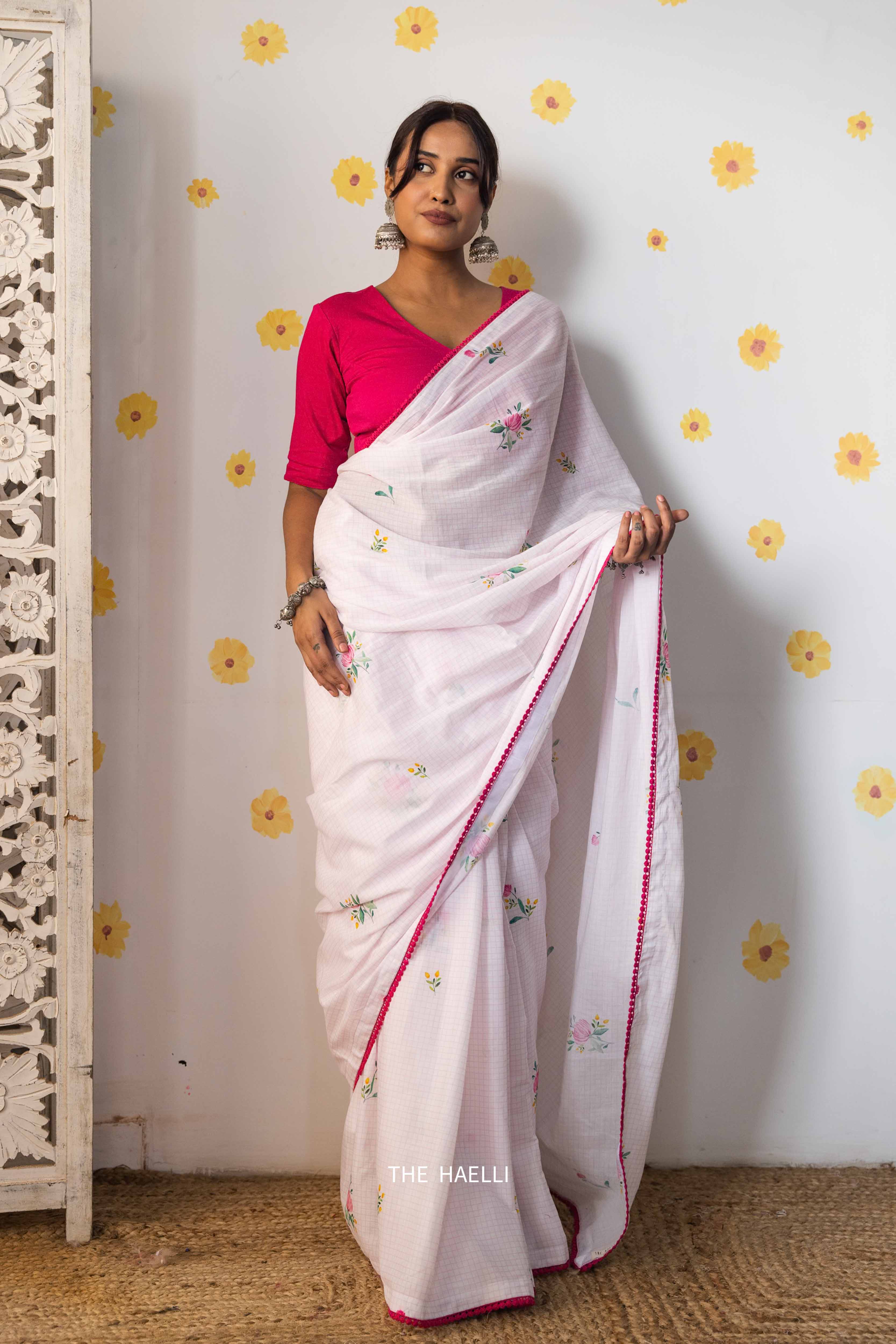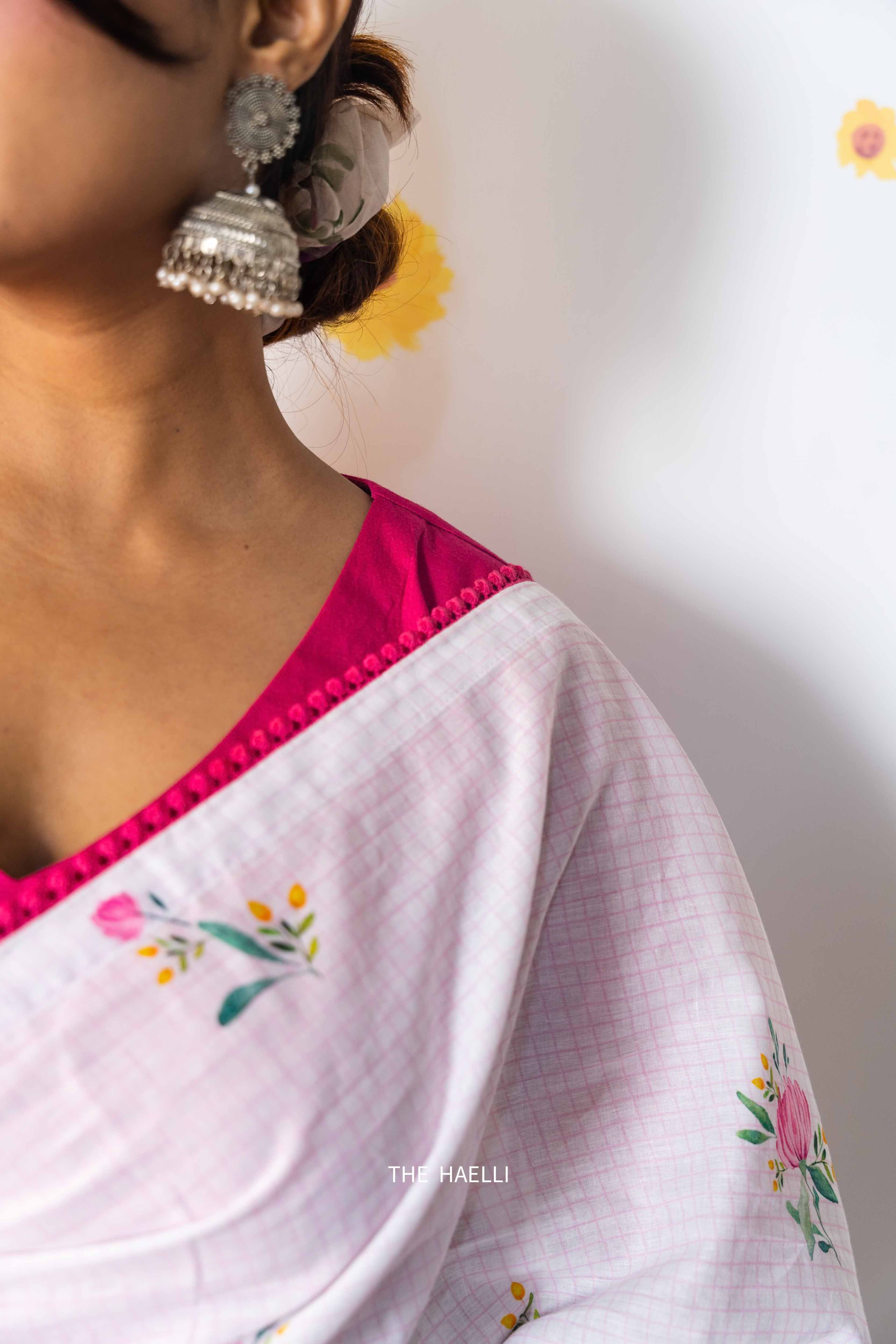 A breezy pure cotton mul saree featuring a soft white base adorned with delicate pink checks and subtle floral prints. Finished with a charming dark pink lace border, it's a perfect blend of elegance and everyday comfort.