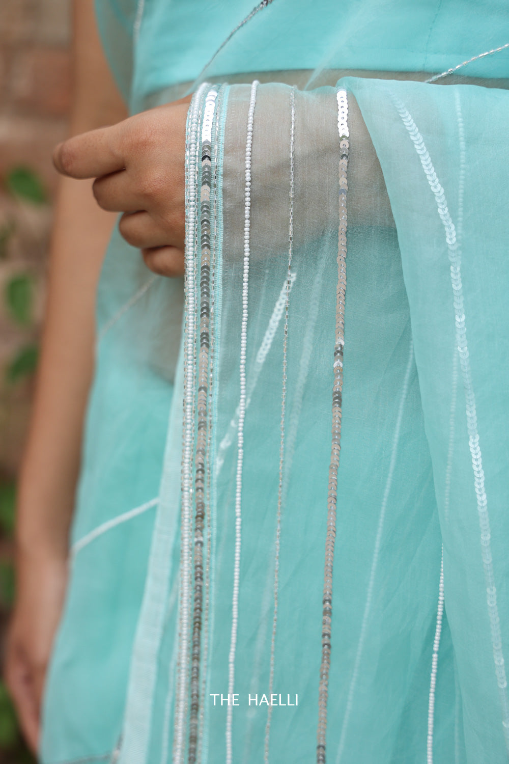 Pure organza silk saree delicately hand embroidered with sitara, pearls, cut dana and zari on cyan base. A dream attire which is subtle yet makes a bold statement.