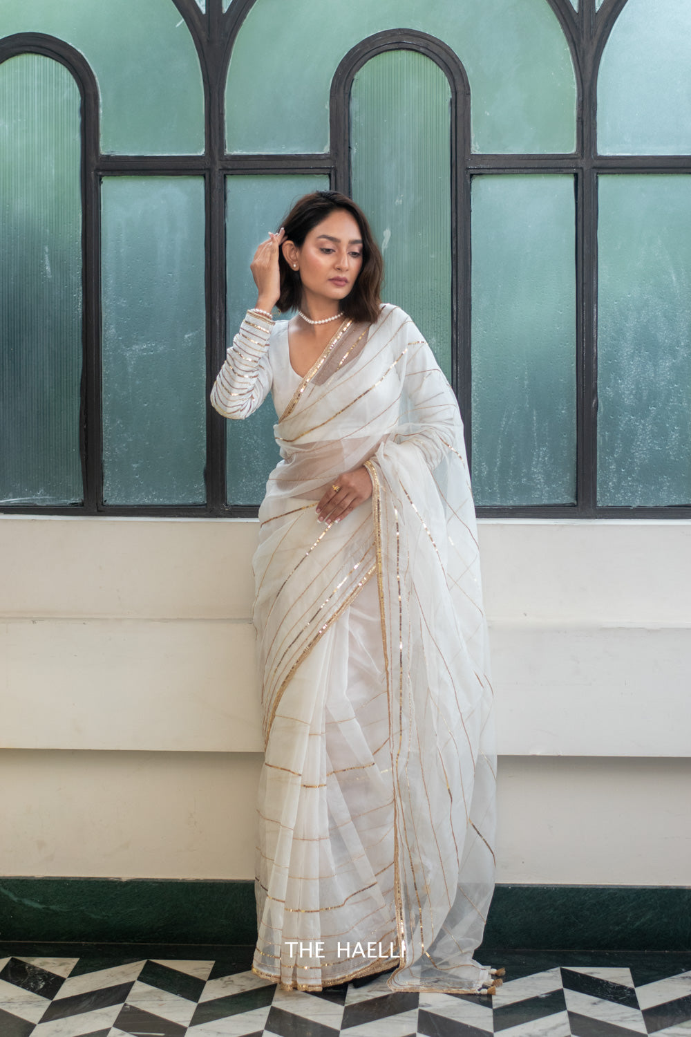 Pure organza silk saree delicately hand embroidered with sitara, moti, cut dana and zari on ivory white base. A dream attire which is subtle yet makes a bold statement.