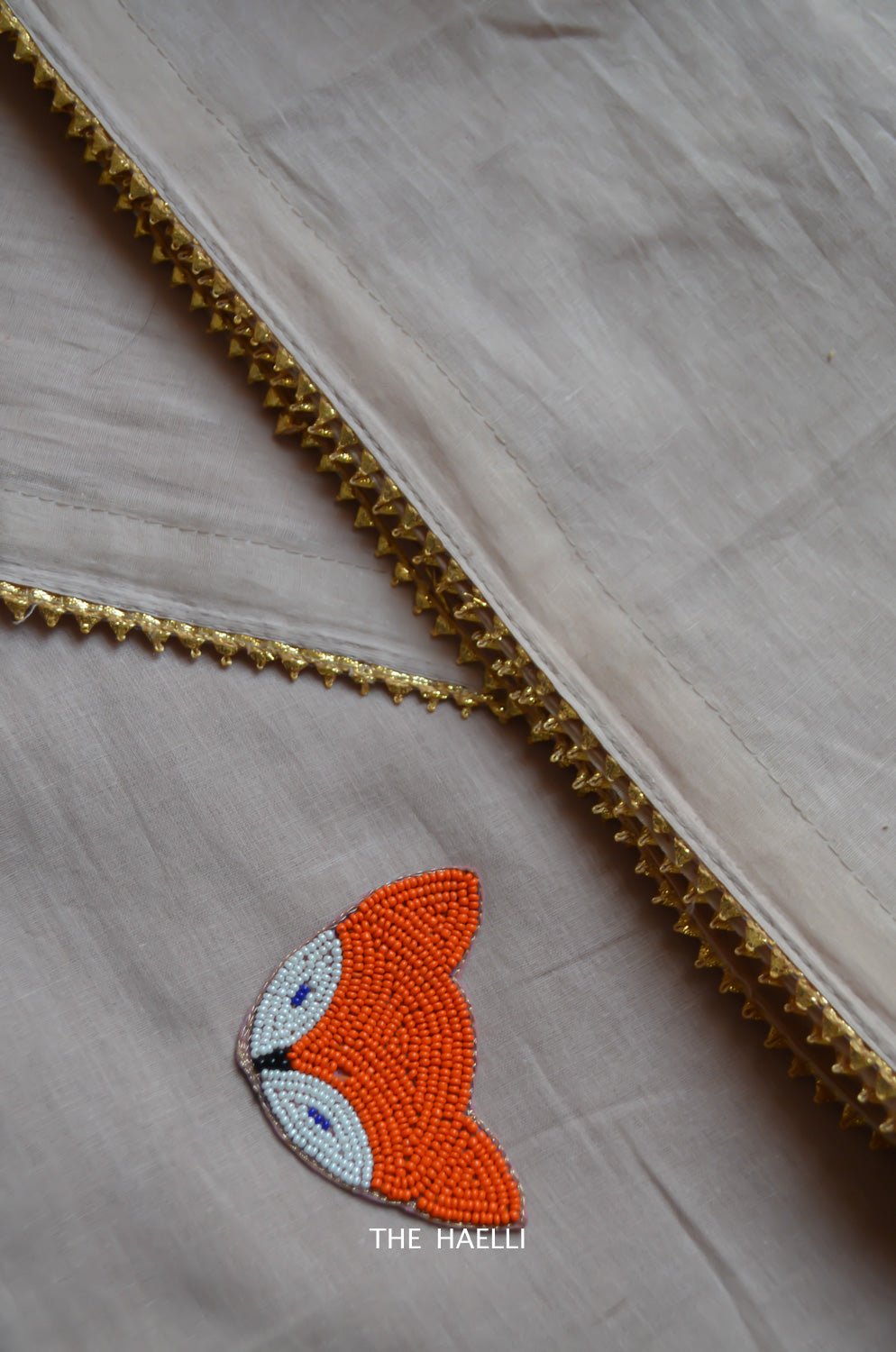 Saree with a twist, Beige pure cotton saree with gold border comes with a hand-embroidered detachable brooch. Pin it to your pallu or to the blouse and have fun styling your saree