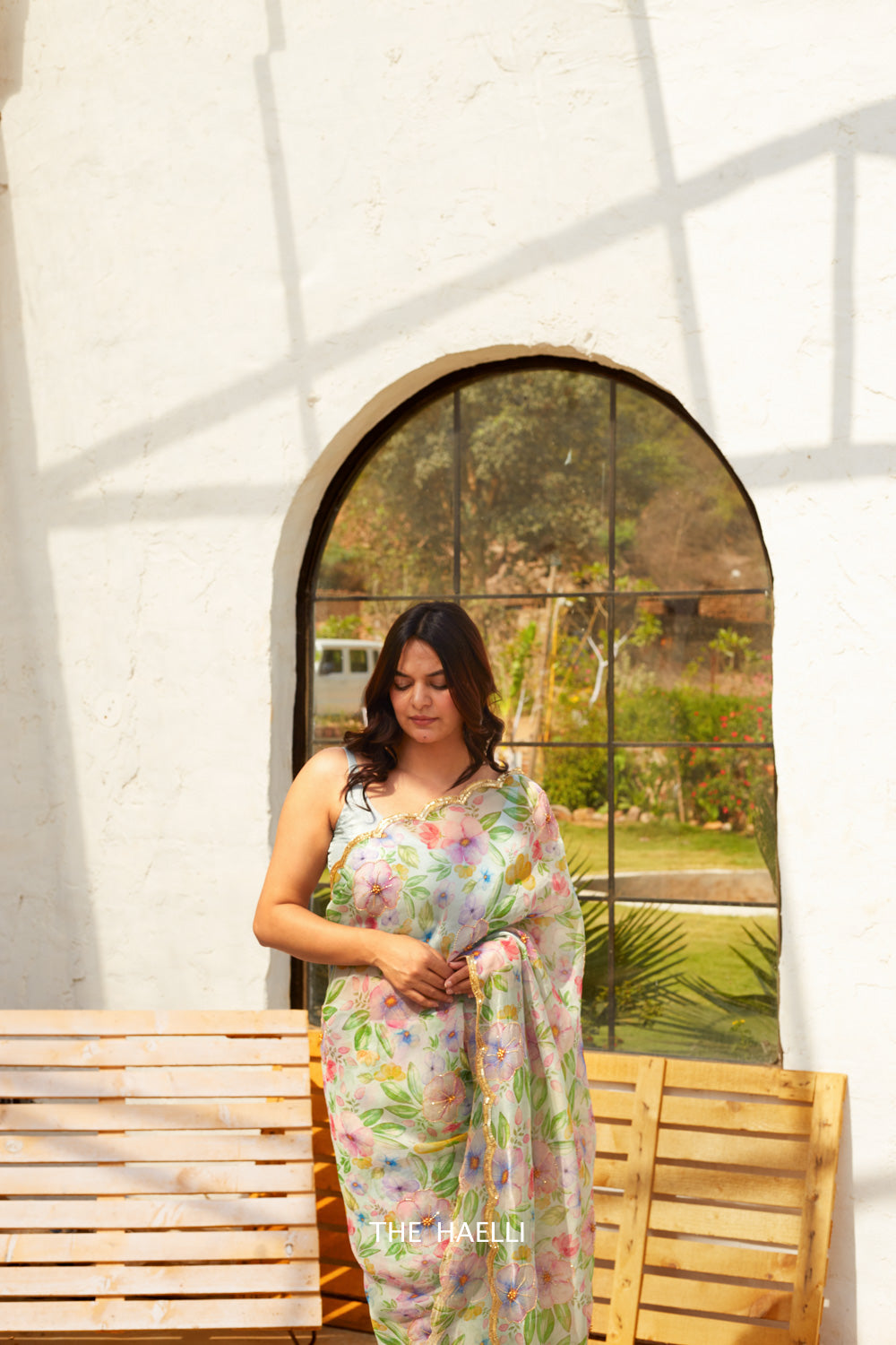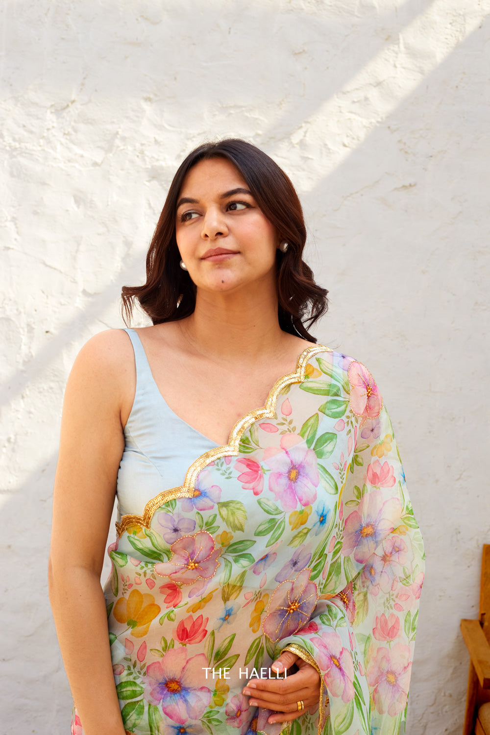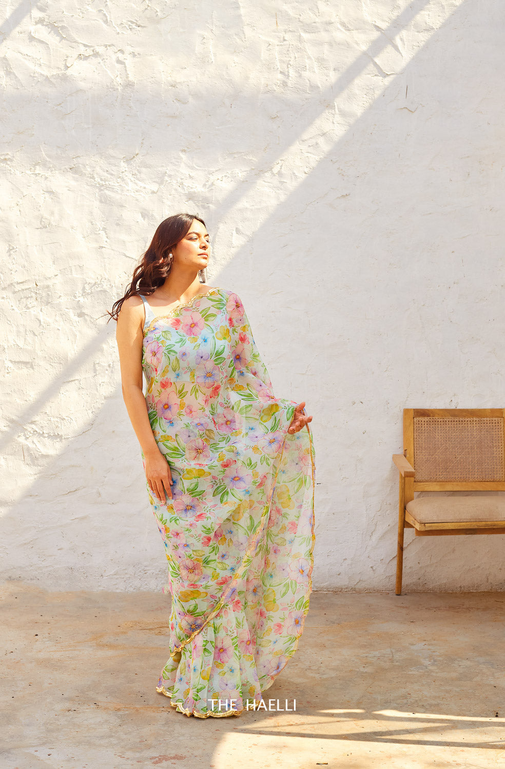 Pure organza silk saree printed with multi colored floral motifs, highlighted through intricate hand-embroidered moti, cutdana and zari work. Along with a defining sitara and cutdana hand-embroidered scallop border will make your summer events filled with colors, class and comfort.