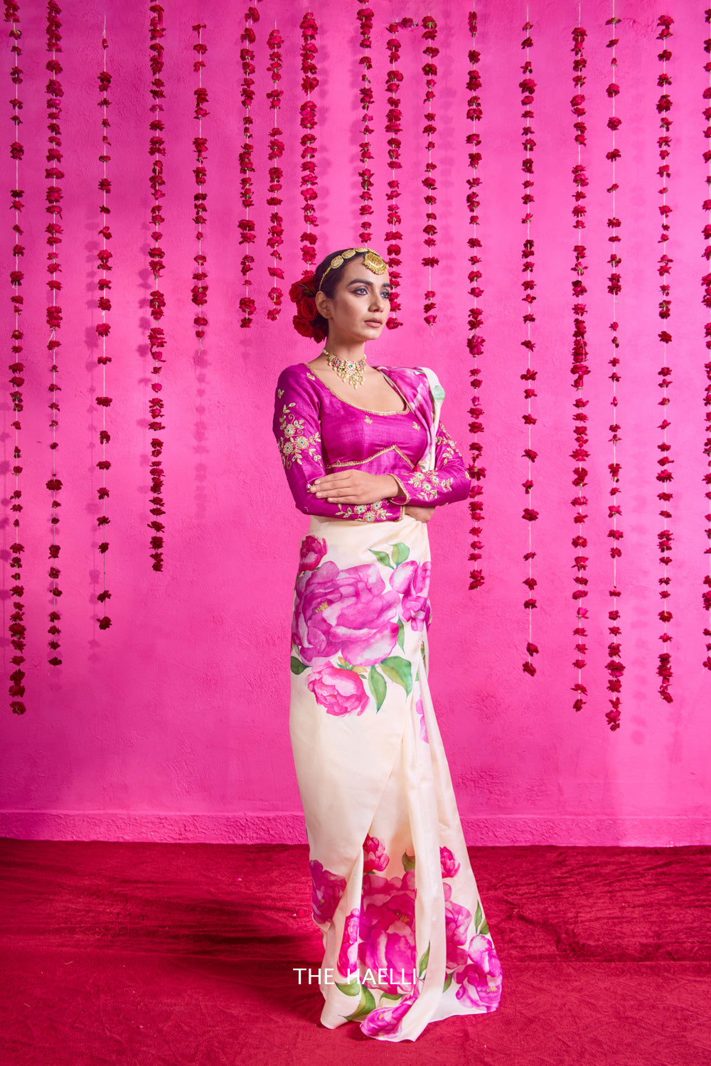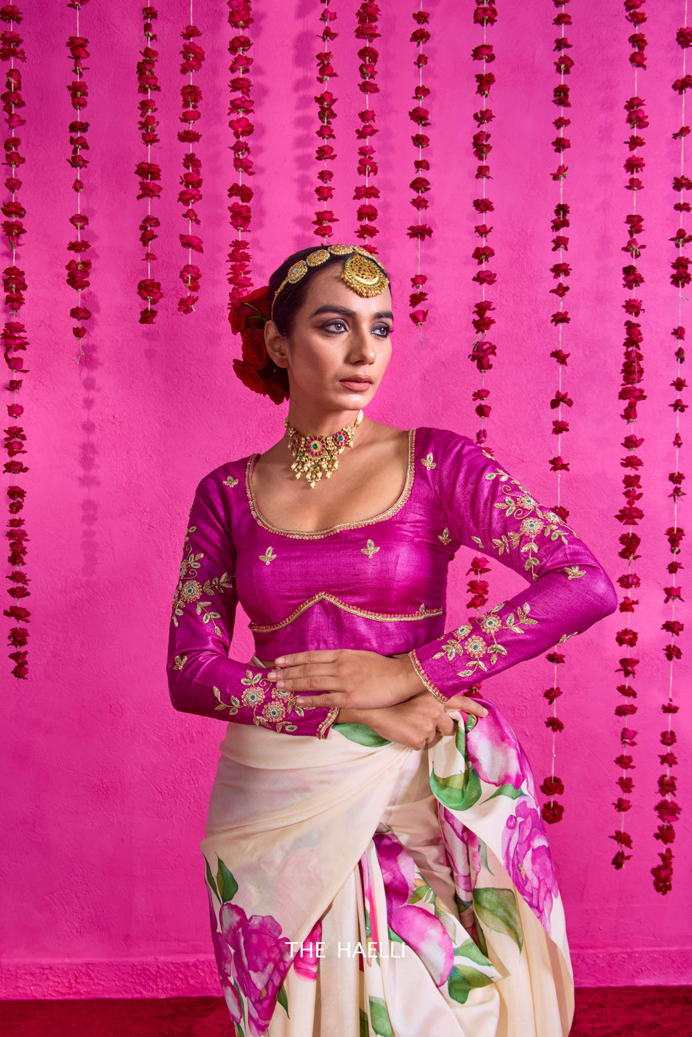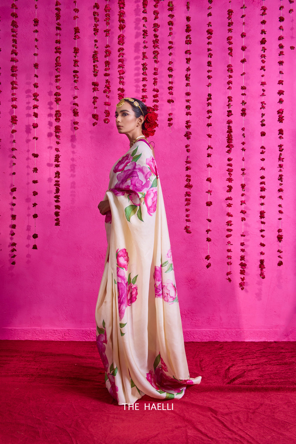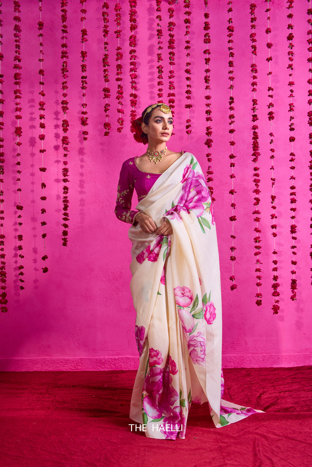 100% handloom pure Tussar silk saree with printed floral motifs.
