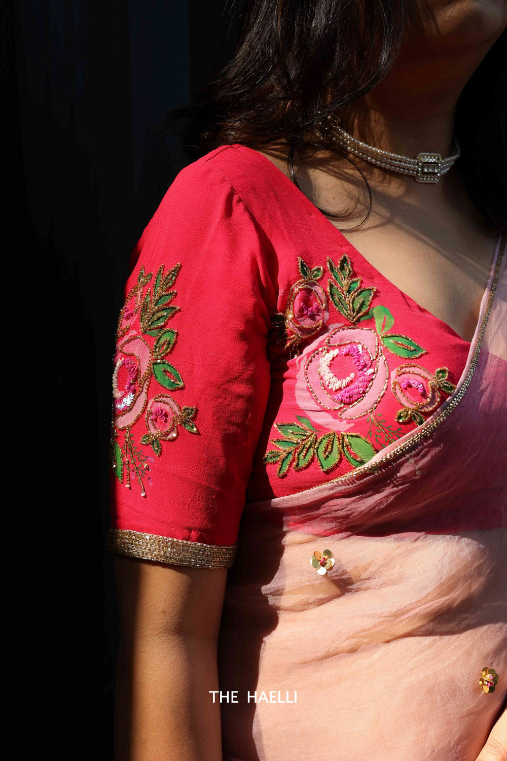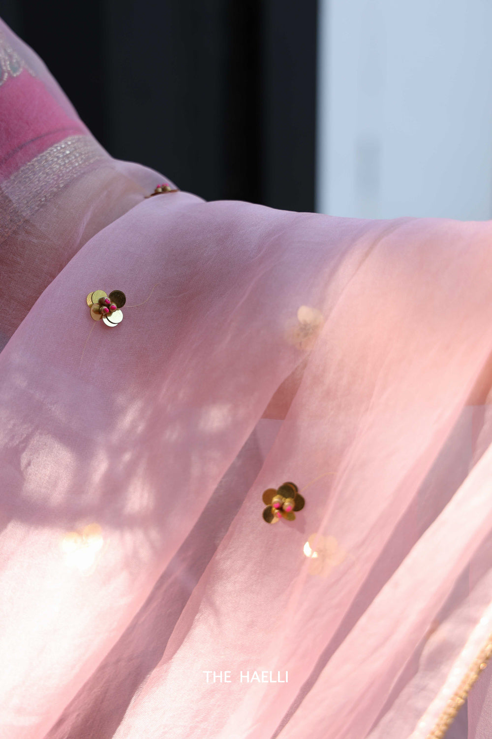 Pure organza silk saree with hand embroidered flowers in sitara, moti and cut dana on pink base, finished with cut dana hand-embroidered border over the edges. A dream attire which is subtle yet makes a bold statement.