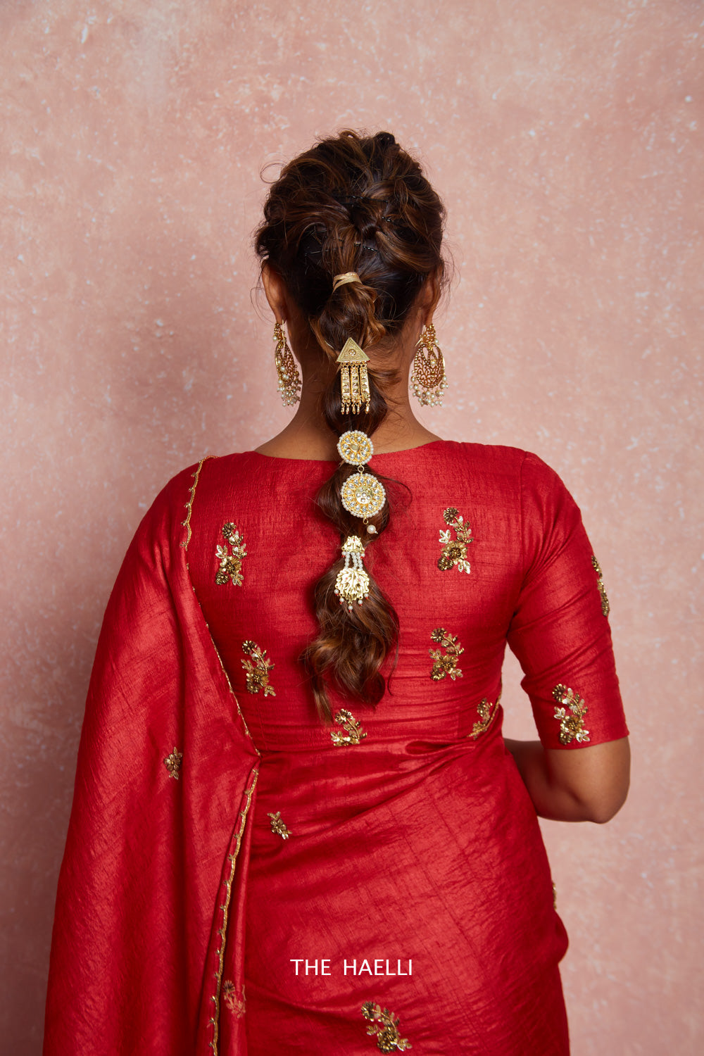 PS: Predraped sarees come with front stitched pleats with adjustable waist hooks which fits S to XL (28 to 38 inches) waist. Please mention your waist size in note section if you wish to size up or down. Height of the saree is un touched, can be adjusted by tucking in the underskirt. Underskirt not included with predrape.