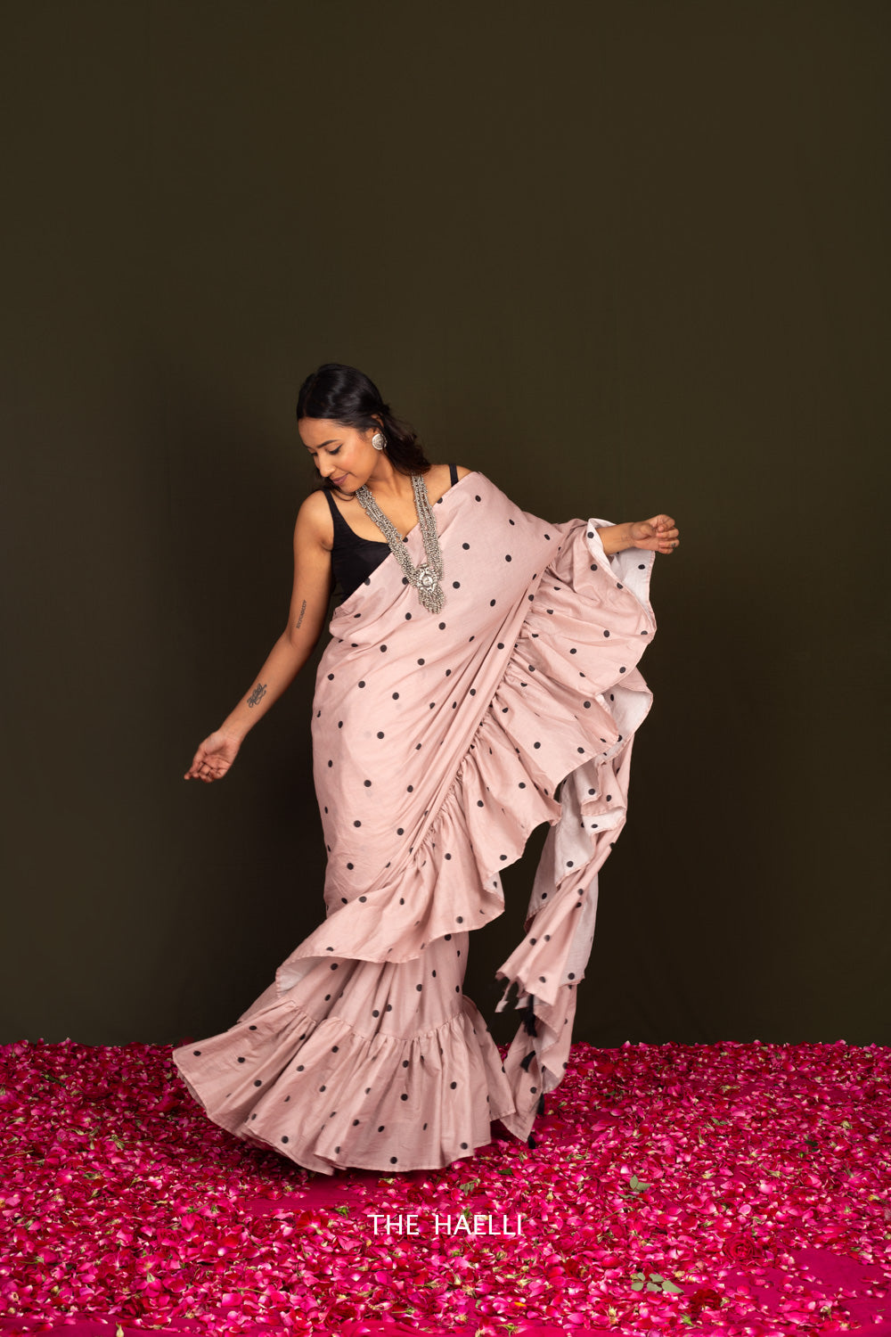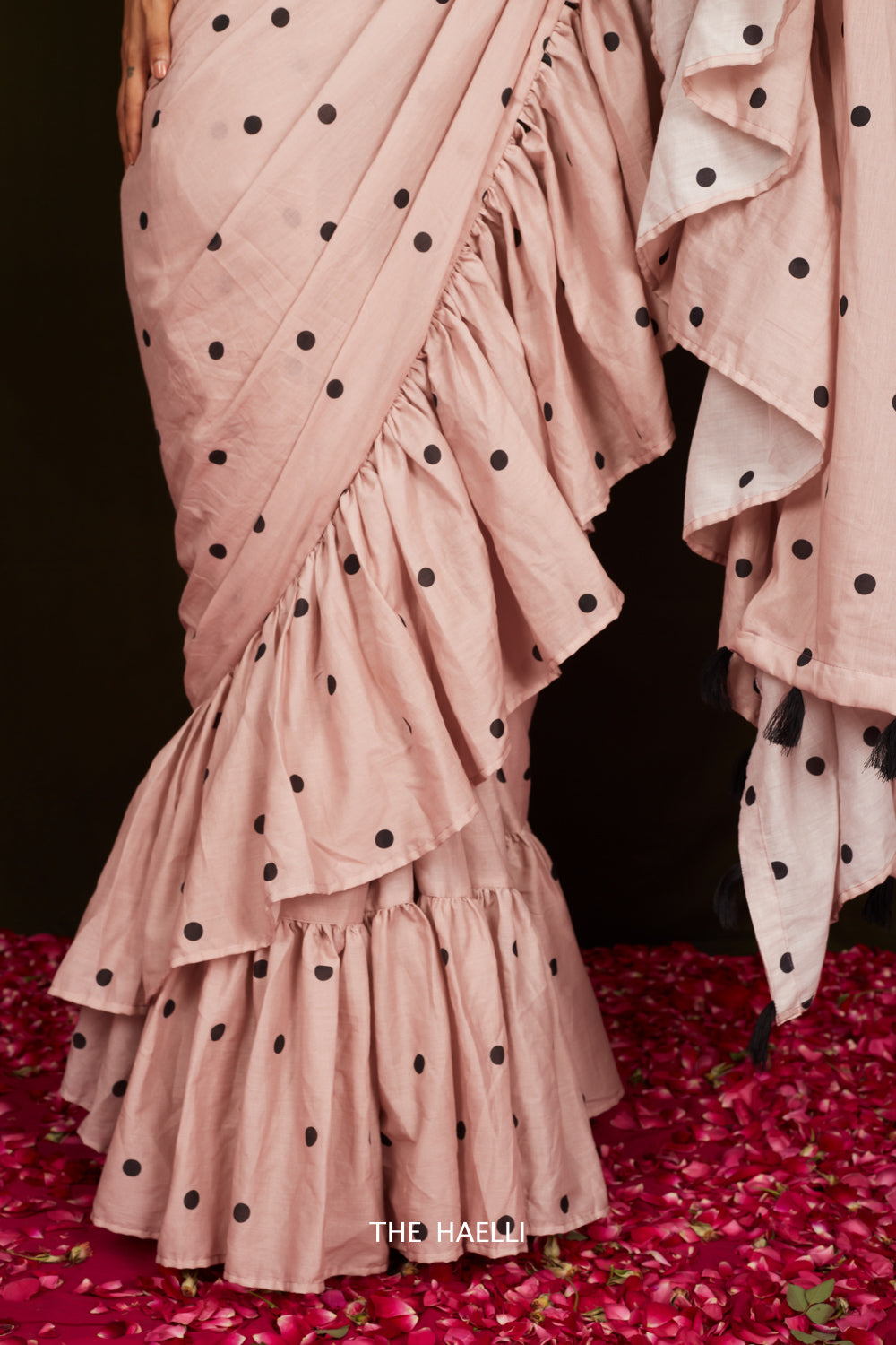 Saree gives us such a huge spectrum to experiment and convert a simple look into a fabulous or fun or quirky look. This blush pink polka printed cotton saree with added ruffles at bottom not only adds femininity to the entire look but also makes so much fun.