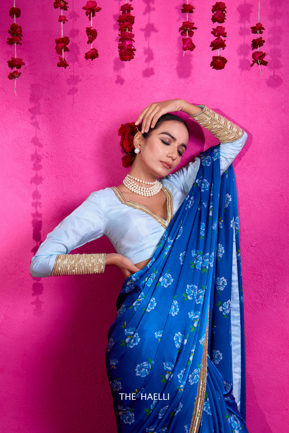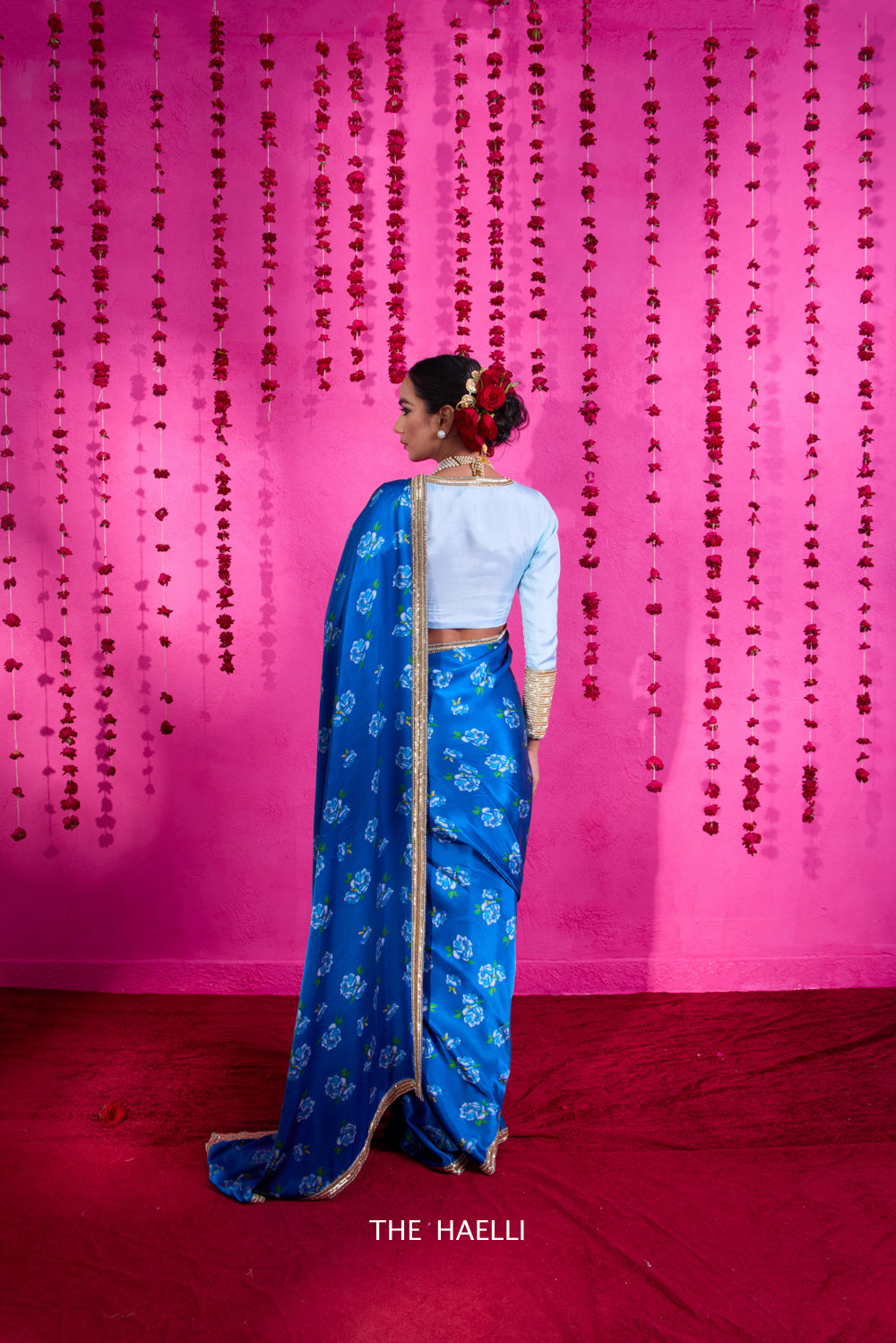 A beautiful saree with fluid fall, printed rose motifs with a delicatly hand-embroidered border with cutdana, pearls and zari