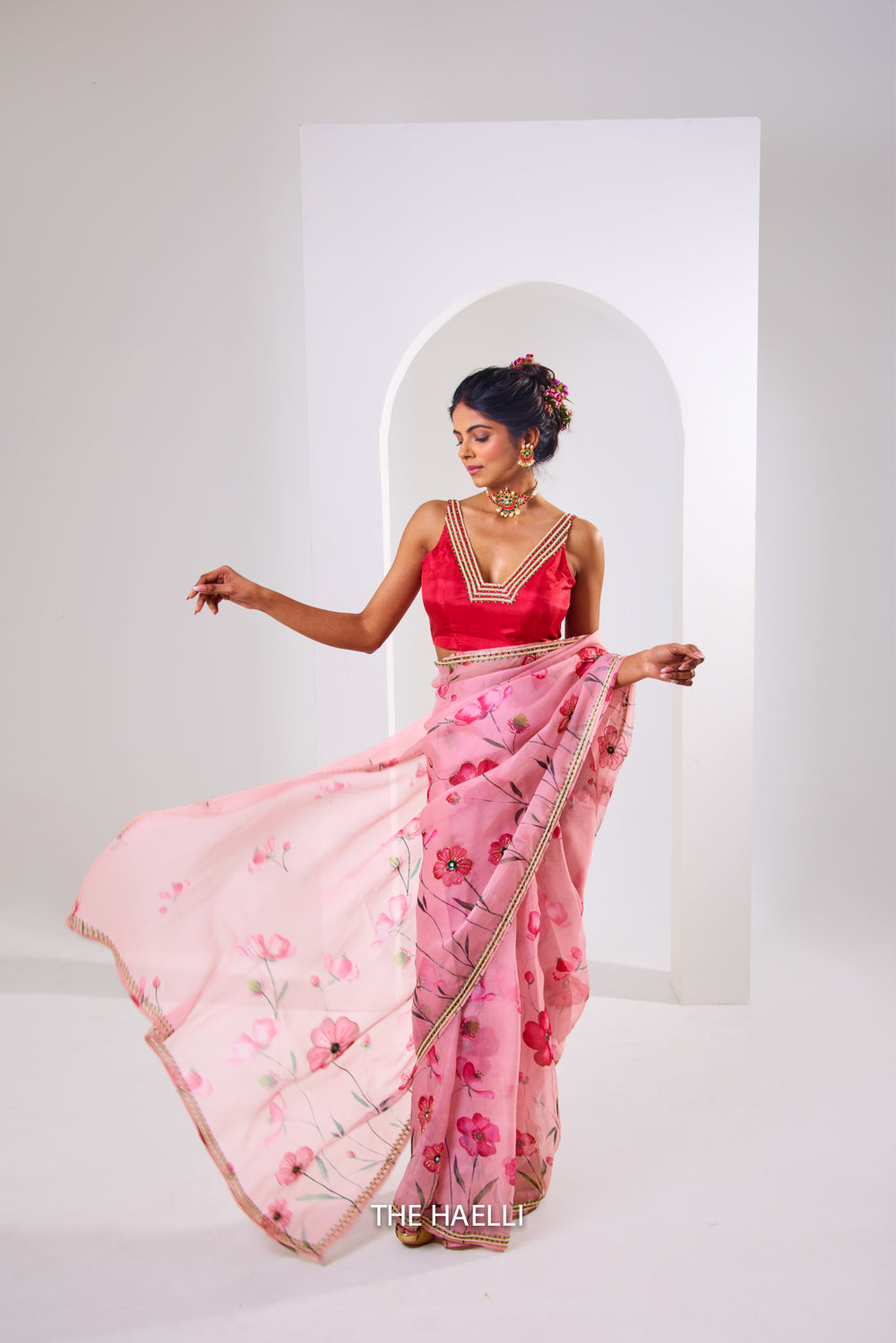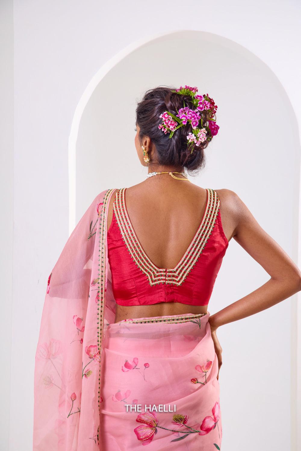 A regal piece with printed floral motifs highlighted with hand-embroidered cut dana, sitara and zari on pure organza silk saree. And a beautiful and delicate hand-embroidered border.