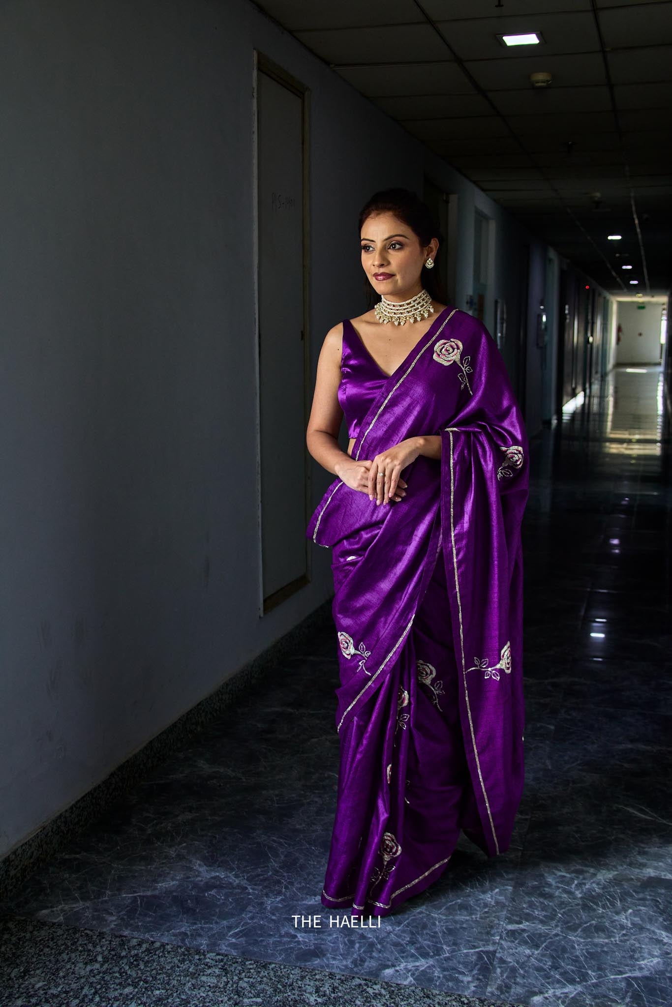100% handloom pure tussar silk saree enhanced with delicately crafted rose motifs with pitta hand-embroidery all over along with defining border.