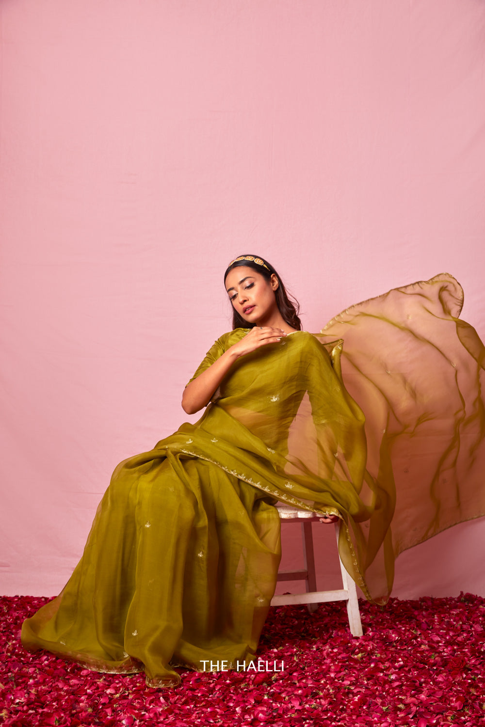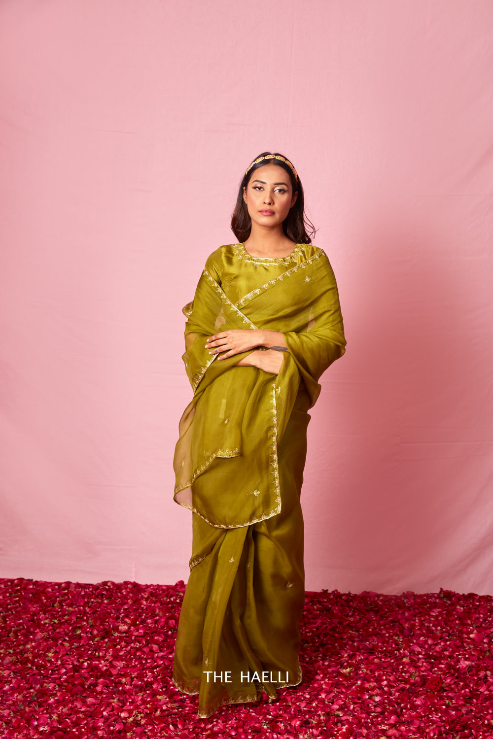 Elegance and simplicity at its best, pure organza moss green saree with delicate hand embroidered zari border and bootas all over the saree.