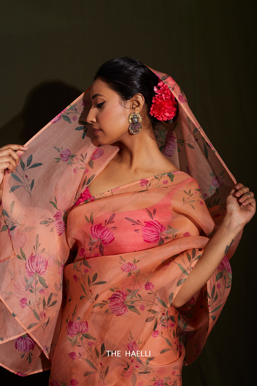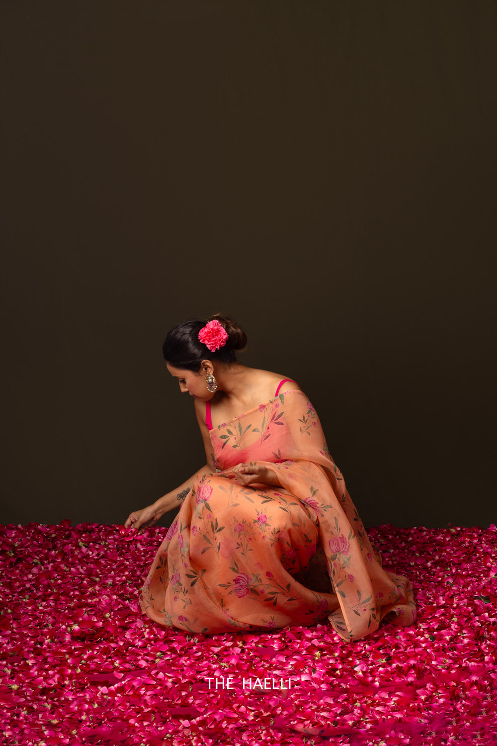 A perfect summery floral organza silk saree, dress up with some flowers for a dinner date or some polki jewelry for a party.
