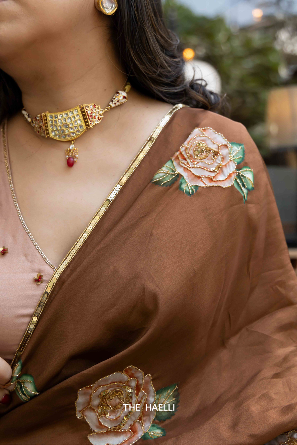 Perfect saree for your festive season, printed roses over silk saree enhanced through hand-embroidery with sitara, cut dana and silk thread. Hand-embroidered border at the edges adds just the correct definition.