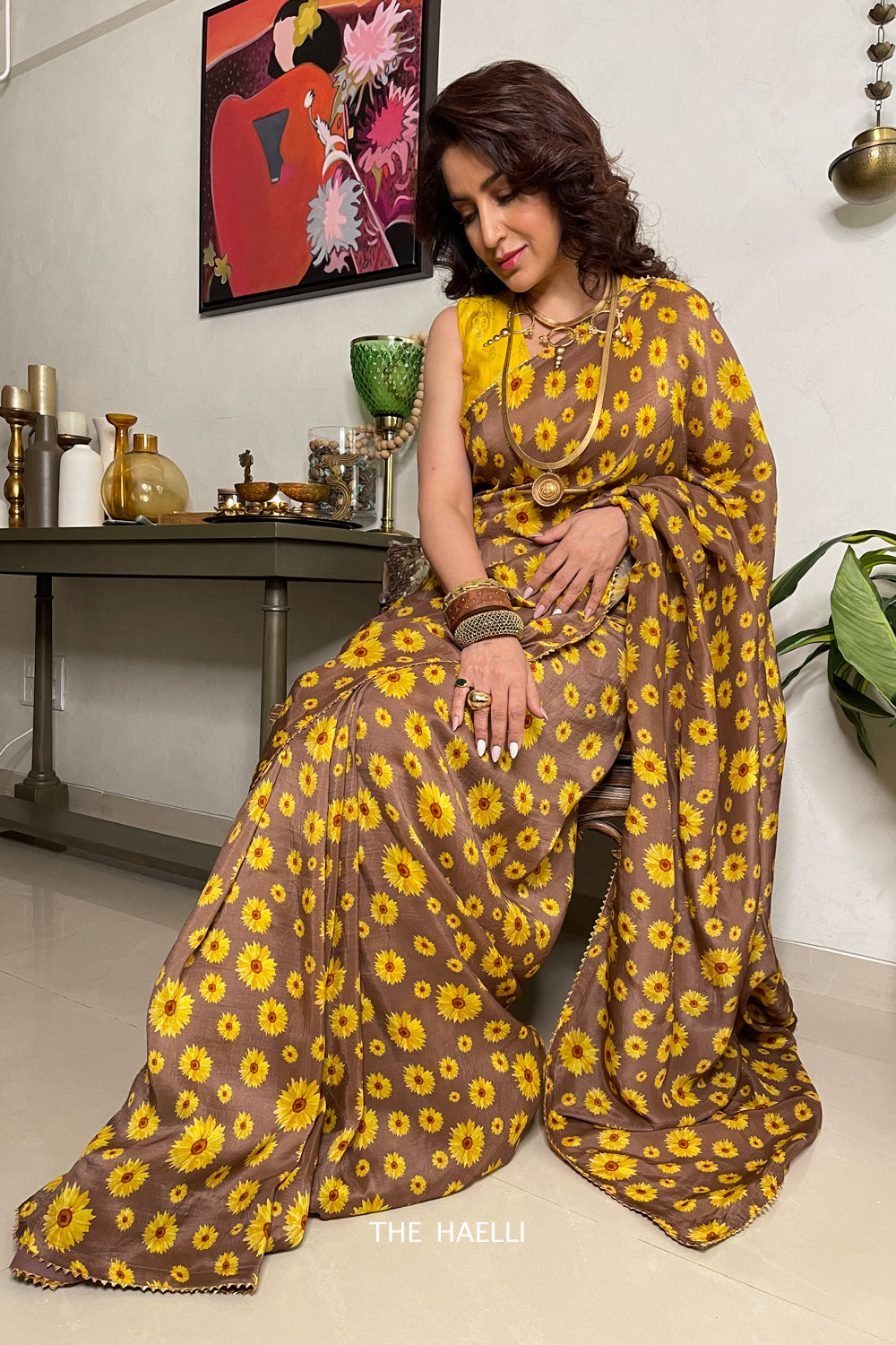 Our statement quirky print on silk saree. Beautifuly printed sunflowers over beige base, adds just the right amount of fun to your ethnic attire.