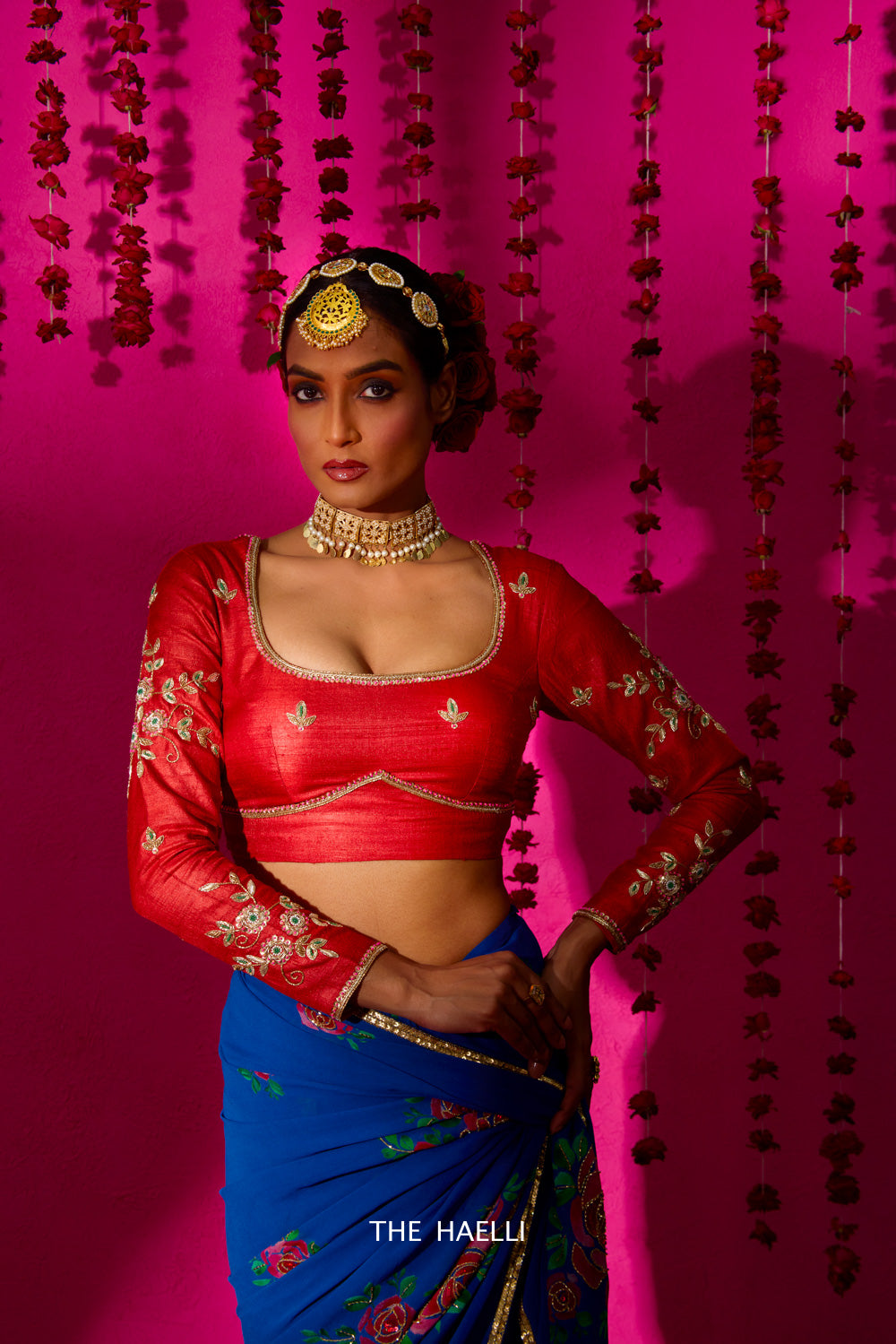 Pure georgette silk saree with printed rose mottis highlighted through hand embroidered sitara, cutdana, zari and gold beads. With a defining hand embroidered border.