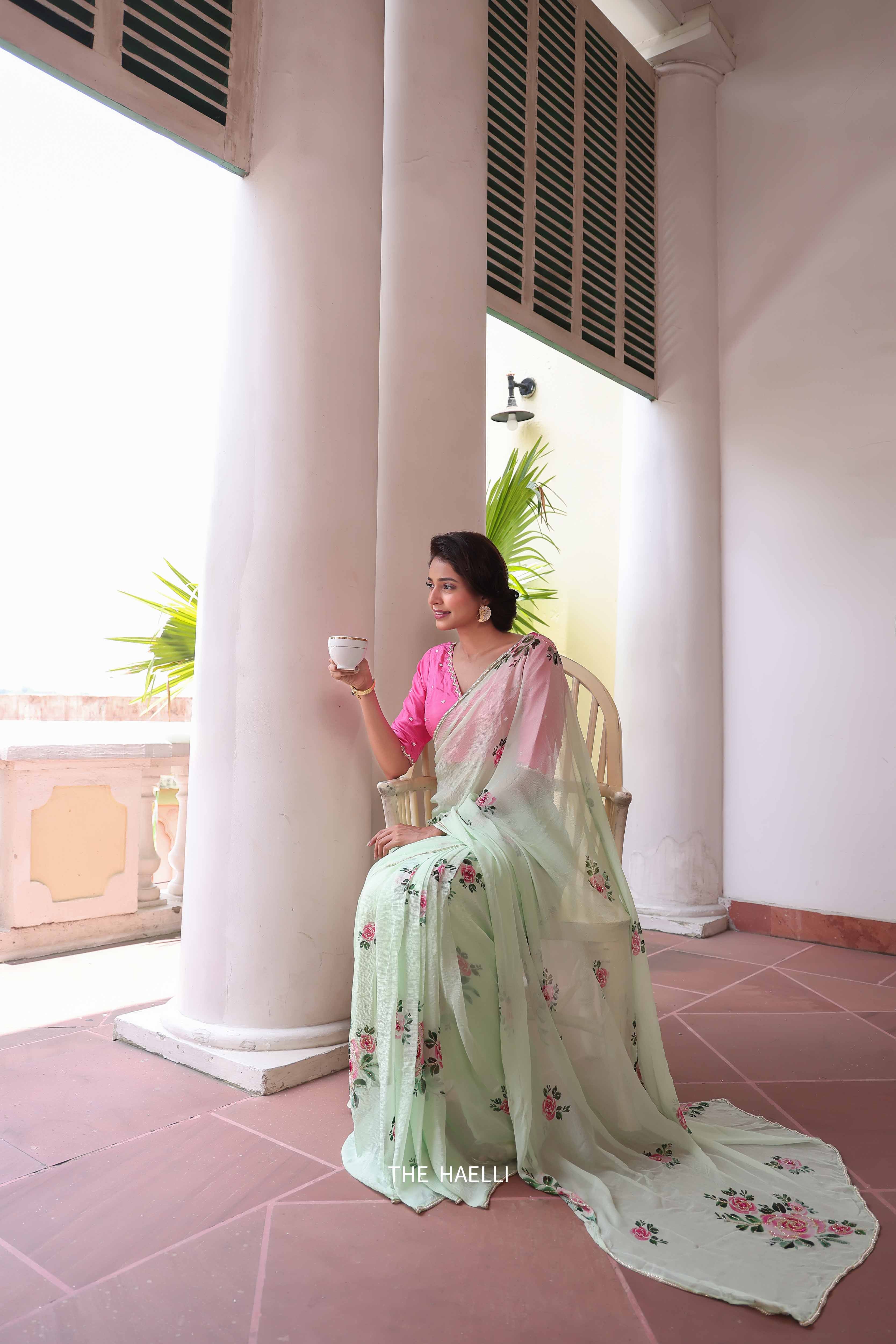 Pure chiffon silk saree with hand embroidered cutdana, moti and sitara border with a hint of hot pink detailing looks and feels like a dream.