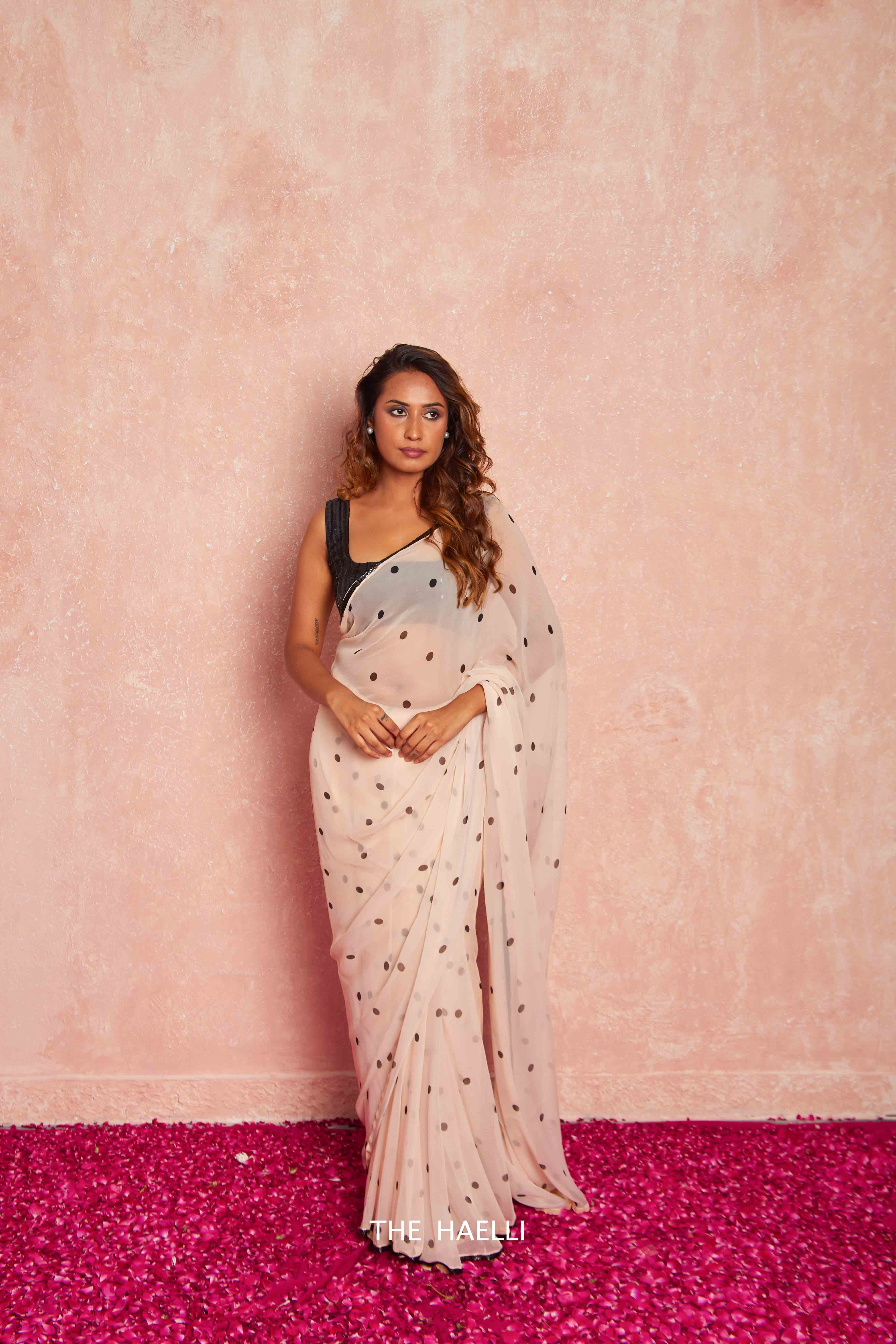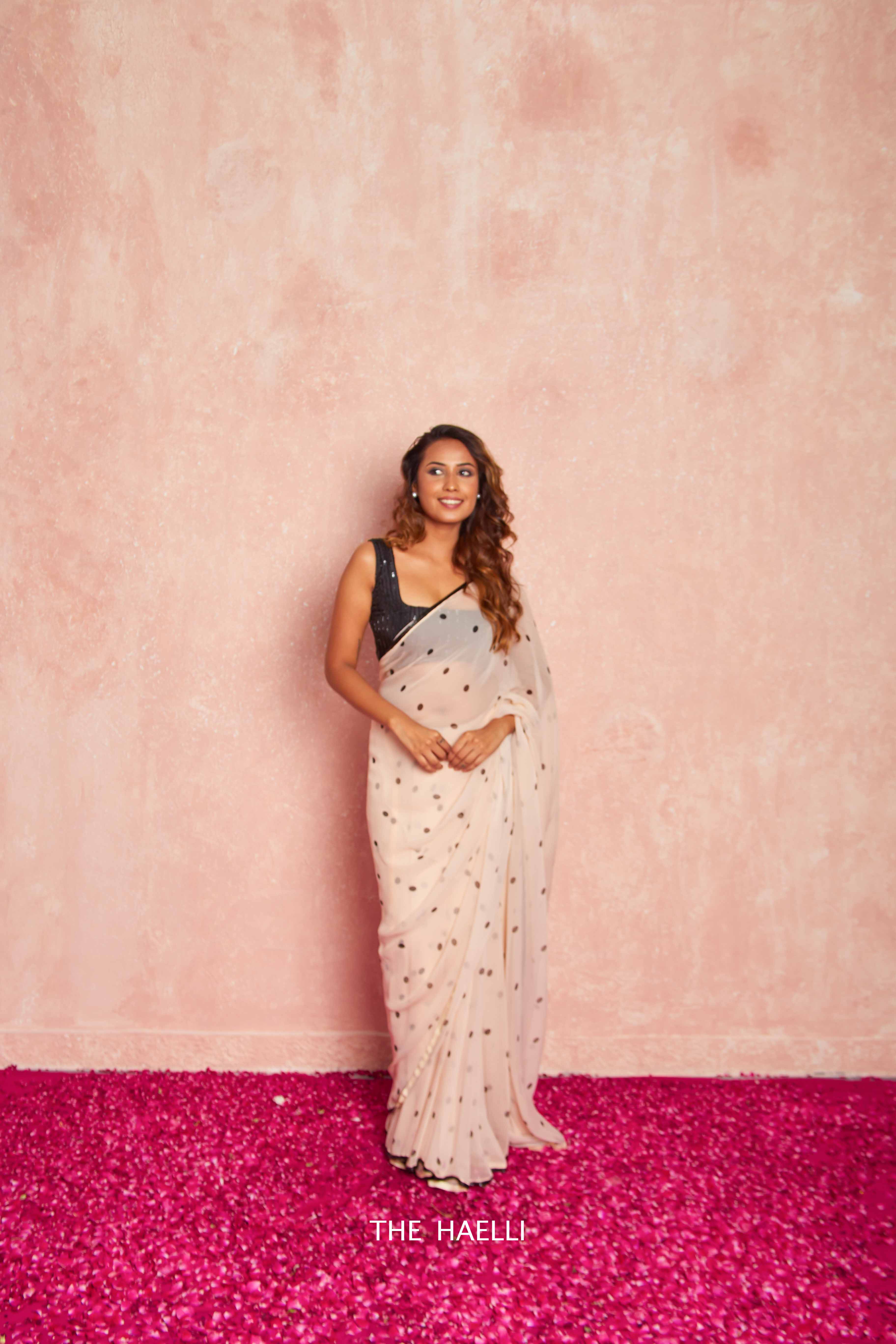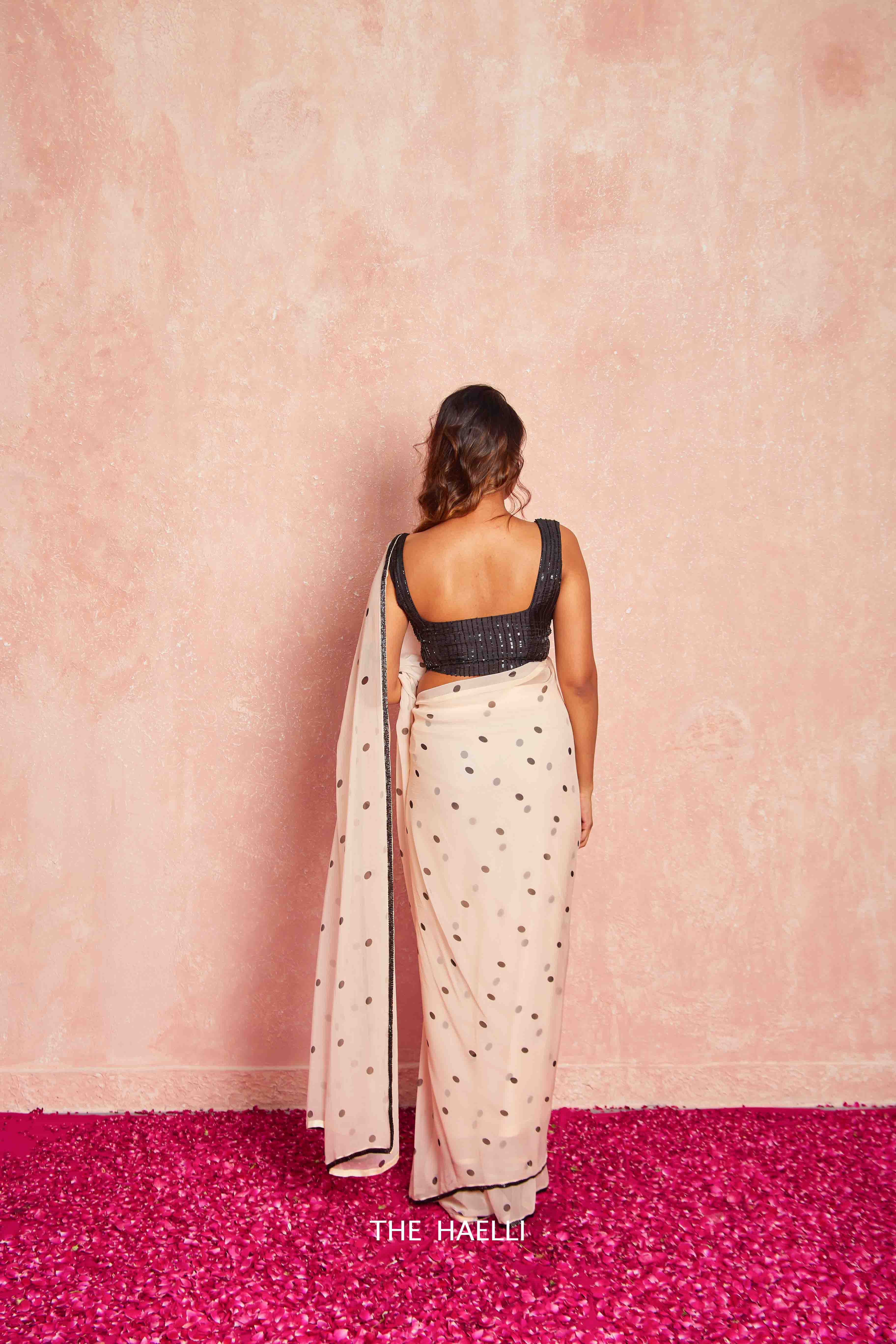 A must in your wardrobe for cocktail, farewell or a office party, black polka saree with embroidered cutdana border.